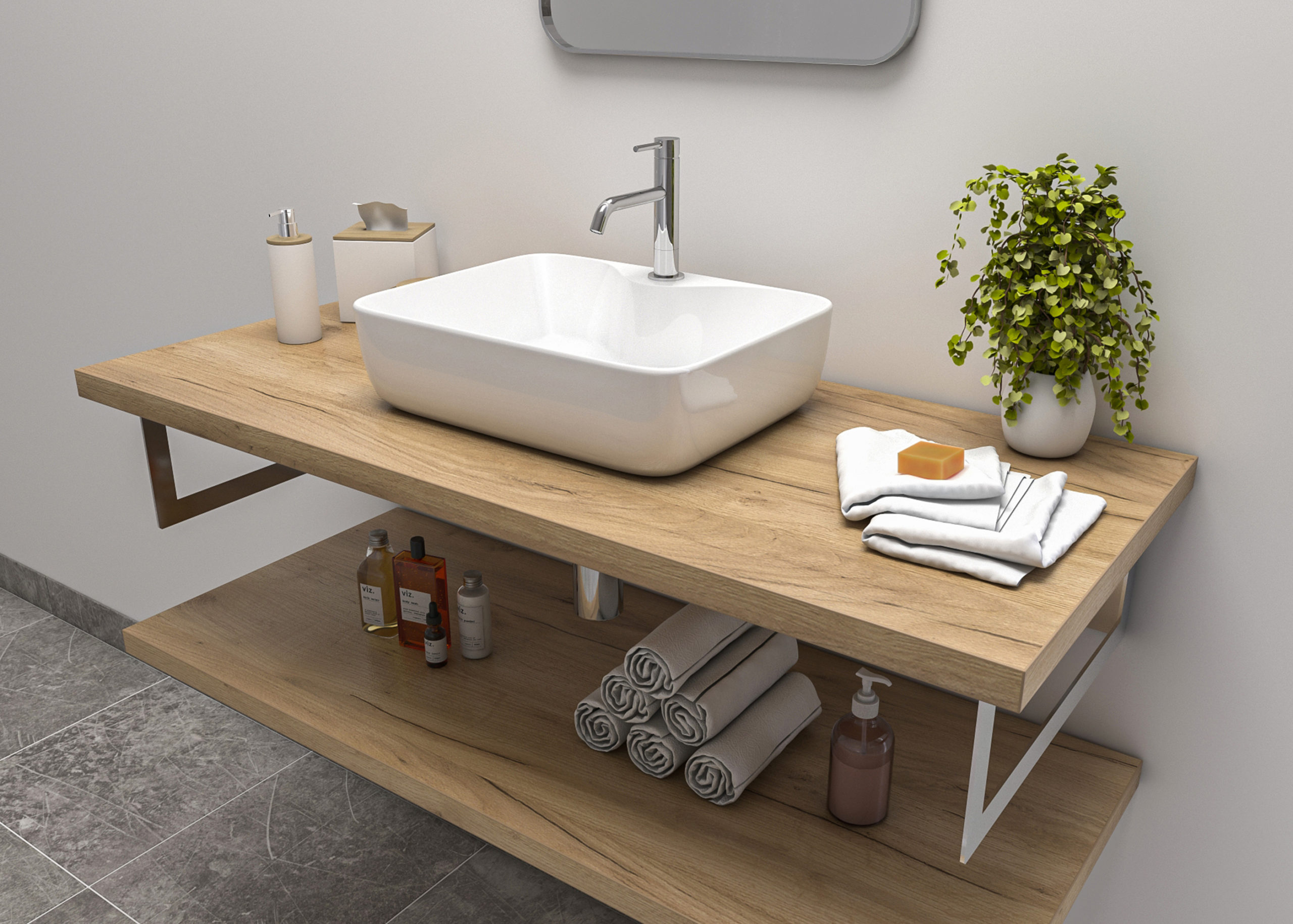 Výroba a predaj umývadlových políc na mieru. Ich základ tvorí drevotriesková doska, ktorá je impregnovaná melamínovou živicou. K dispozícii sú v rôznych povrchových úpravách, vrátane lesklej, matnej a nádhernými štruktúrami dreva.