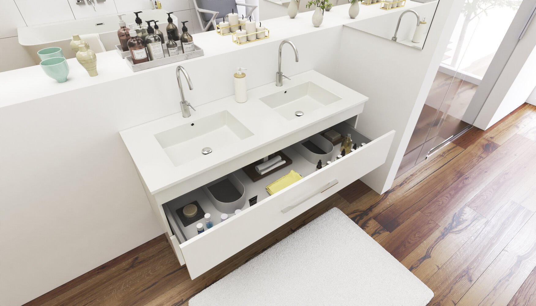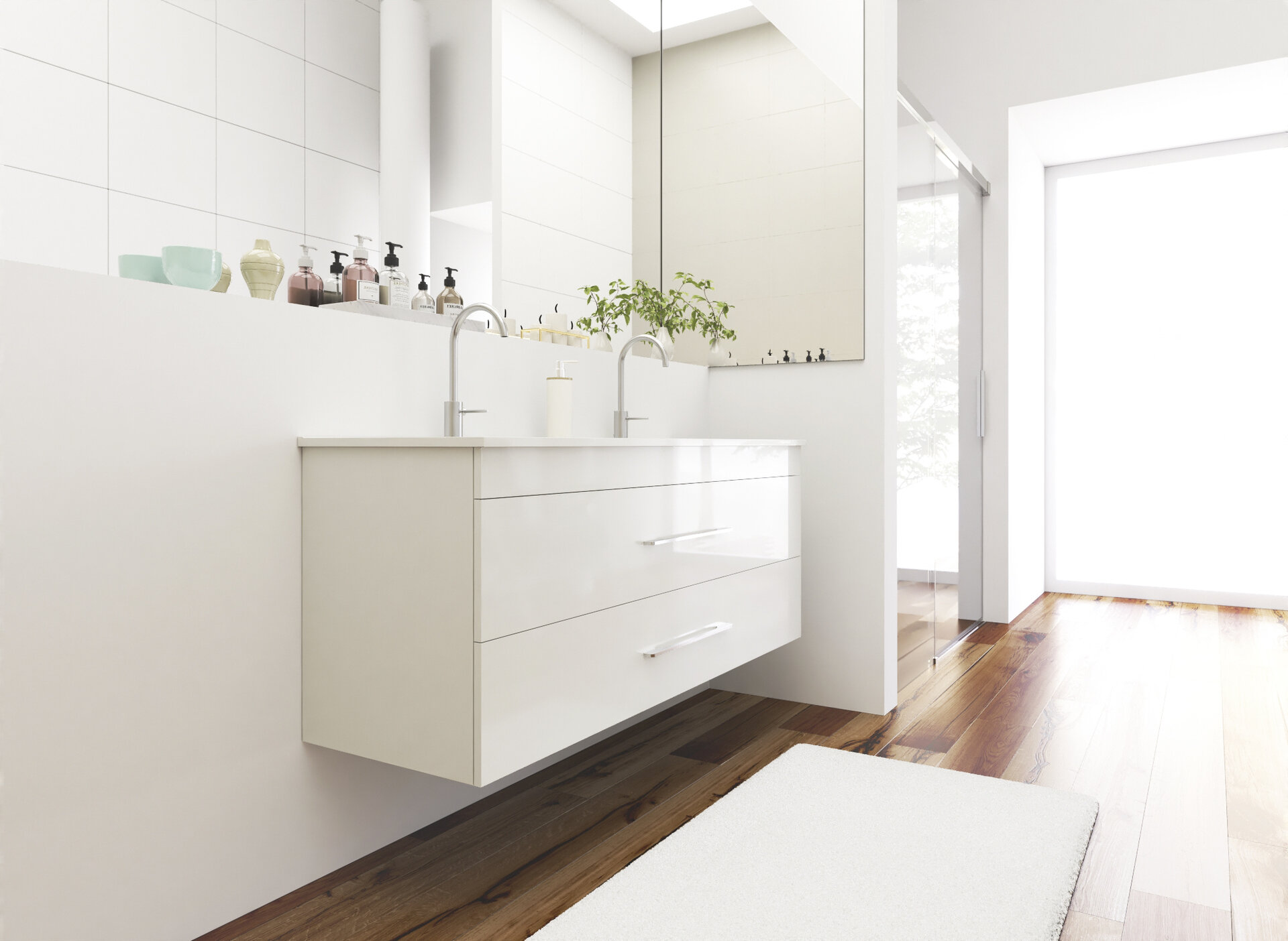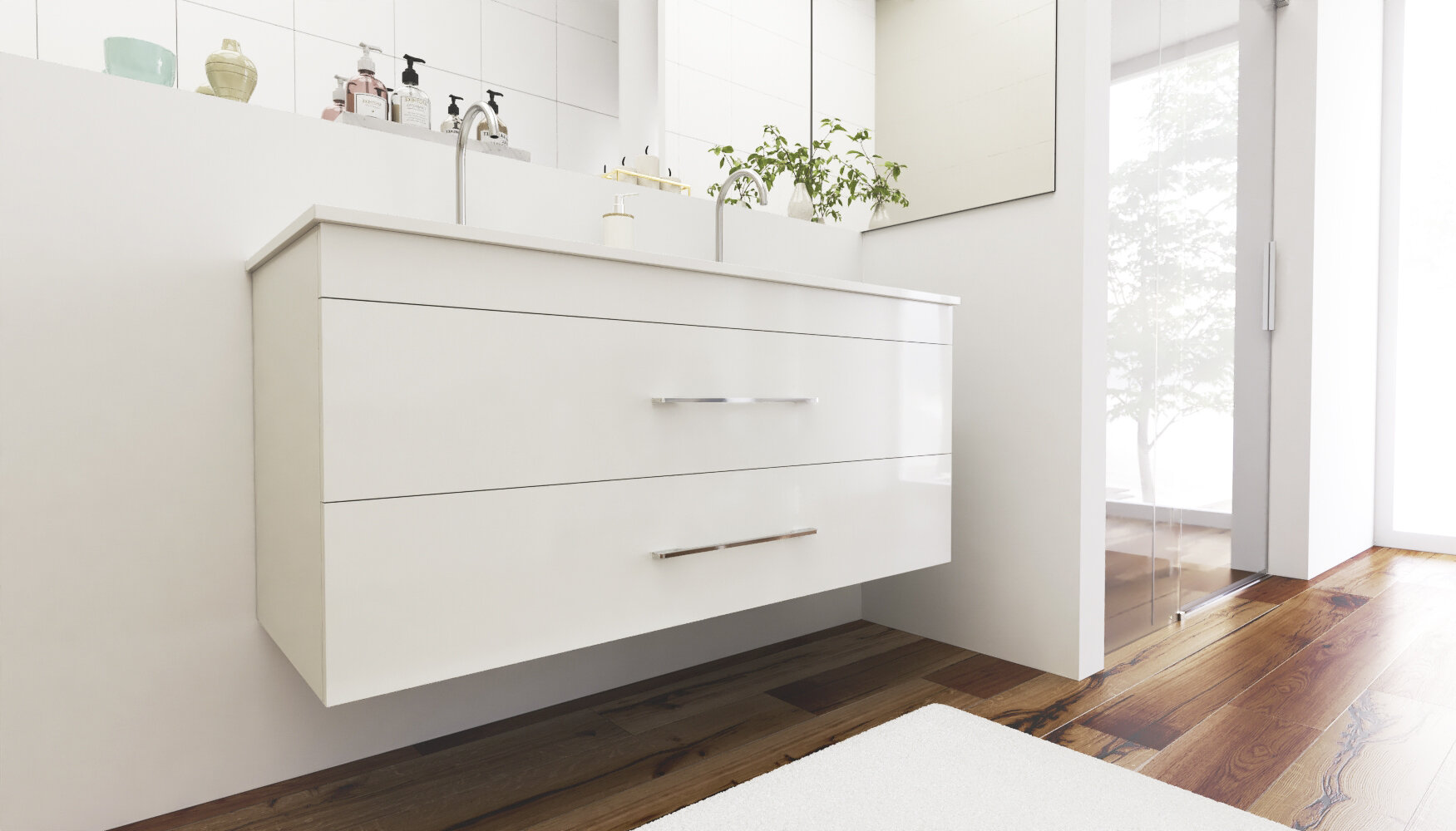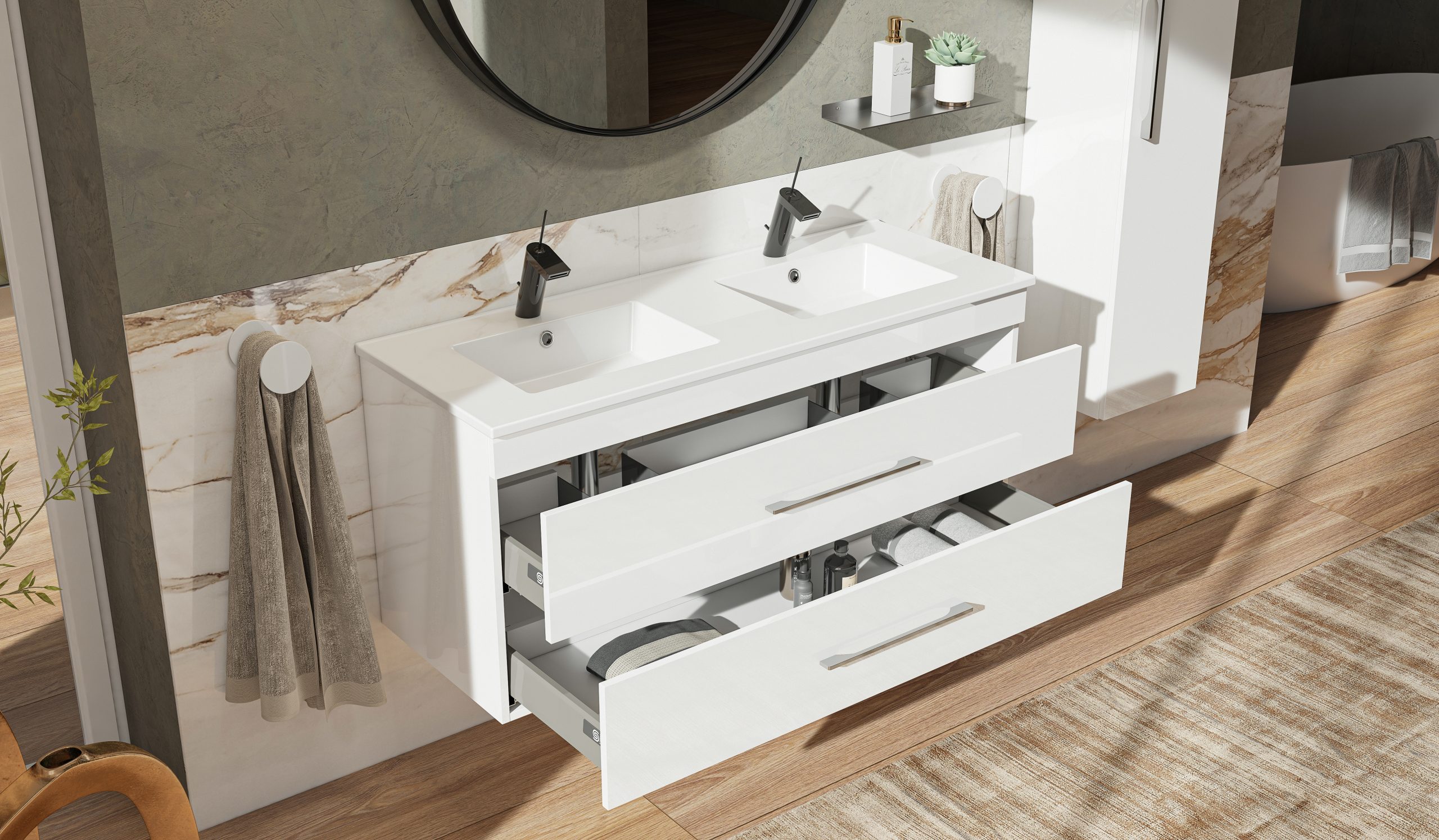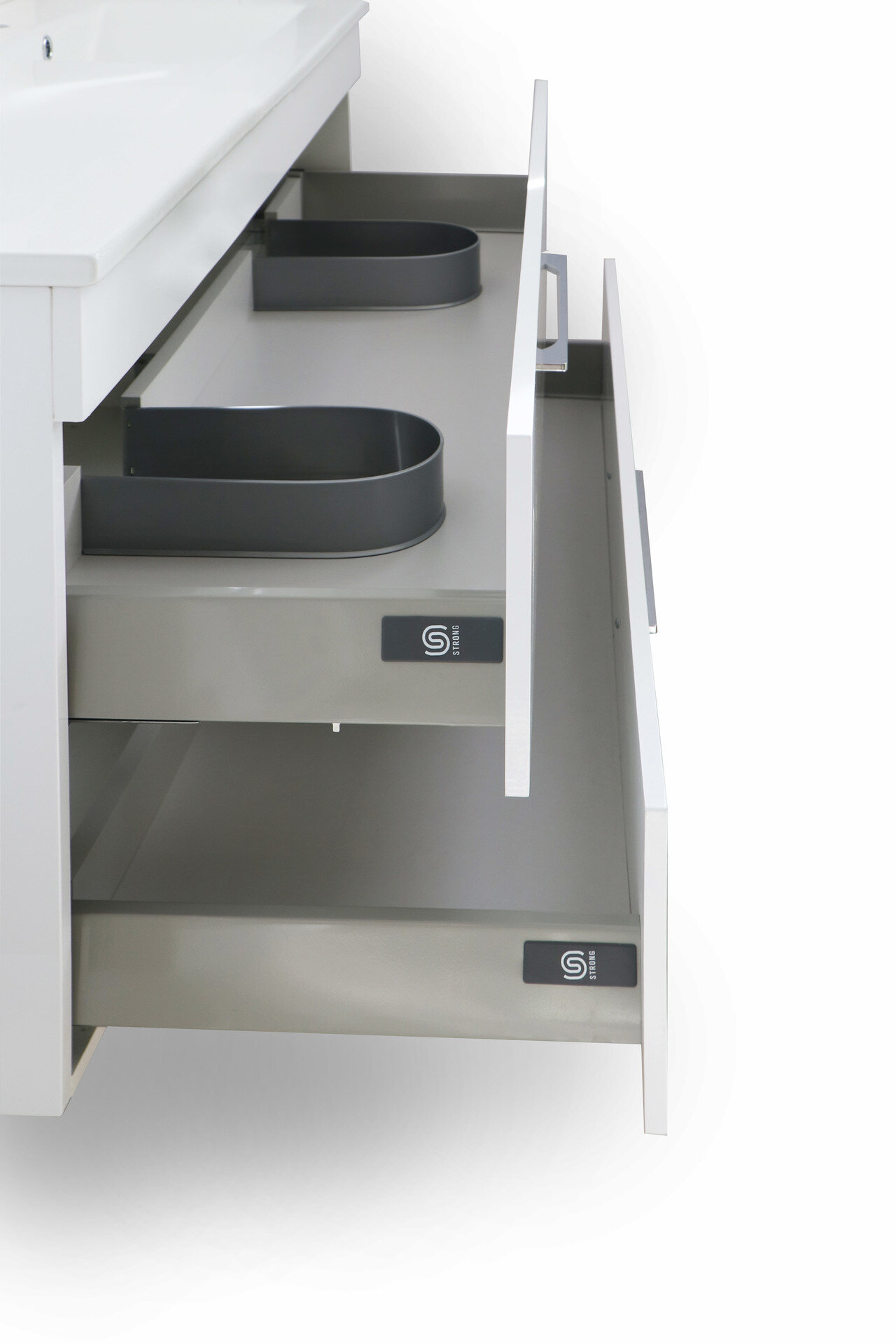 Závesná skrinka pod umývadlo s dvoma zásuvkami Dokonale zladené tvary kúpeľňových skriniek série ENERGY2 v kombinácii s chrómovými úchytmi vytvoria očarujúcu štýlovú kúpeľňu. Kvalitné prevedenie a materiály sú zárukou dlhej životnosti. Skrinka je dodávaná zmontovaná. Dodacia lehota je 4 – 5 týždňov.