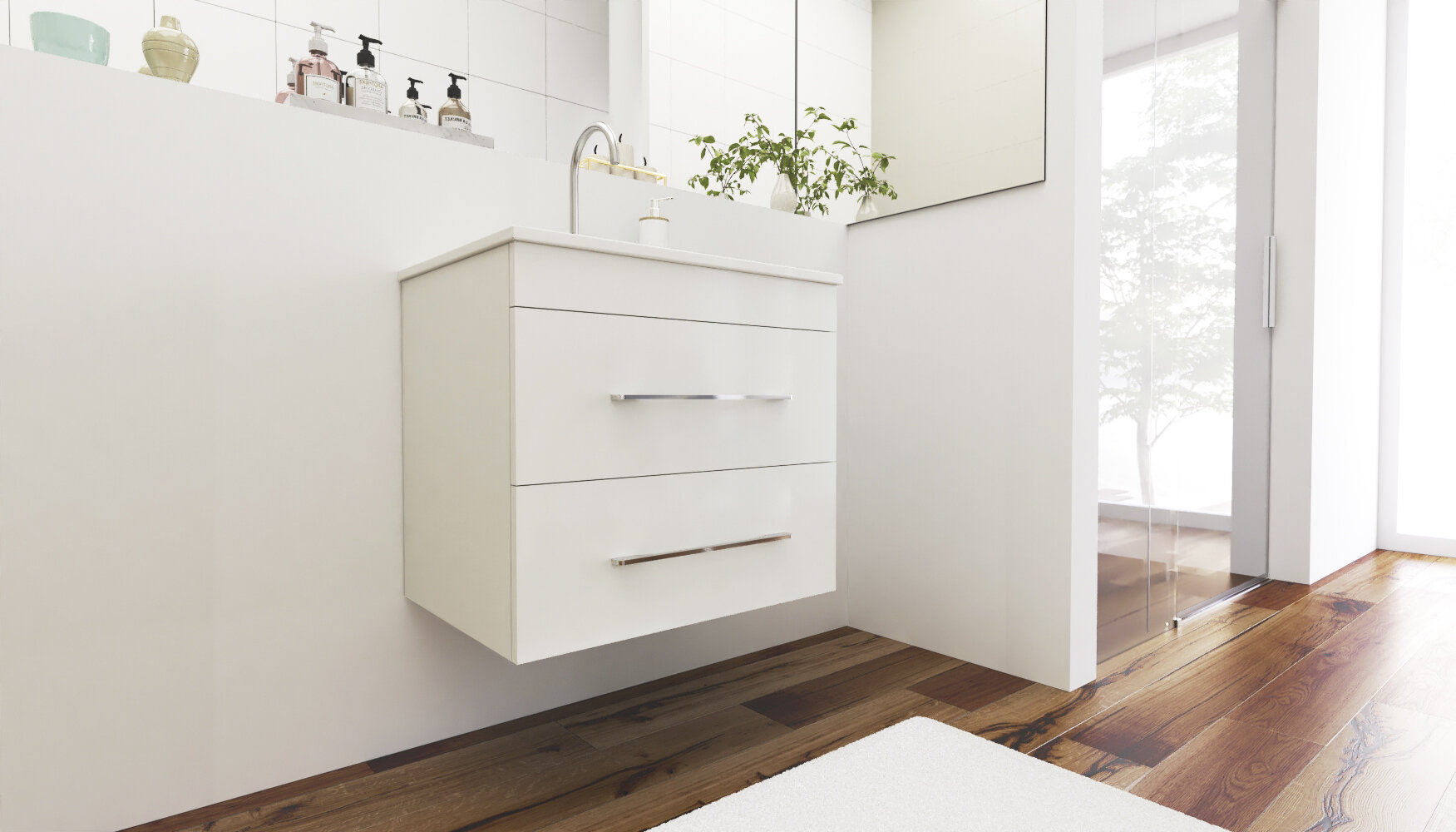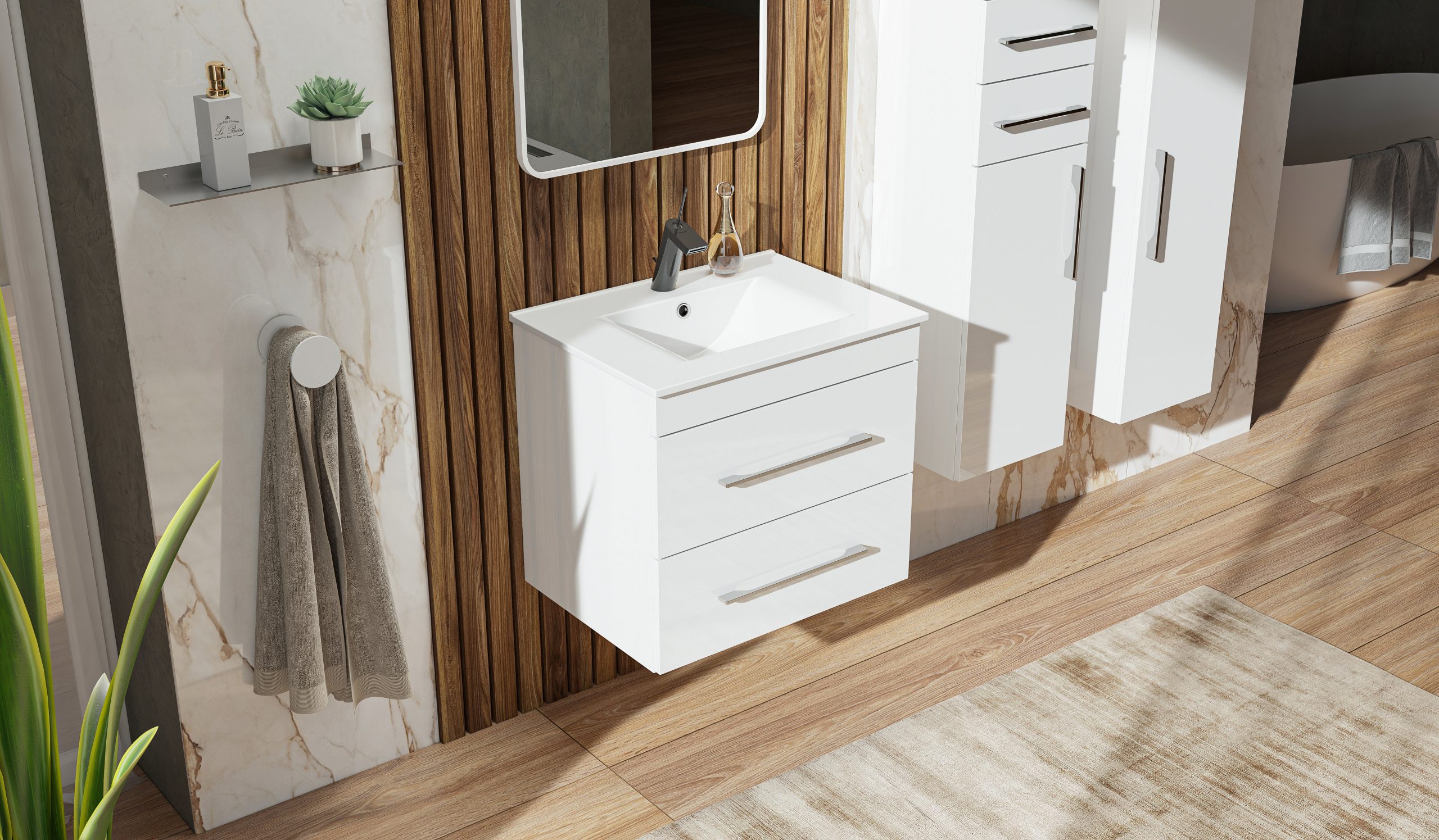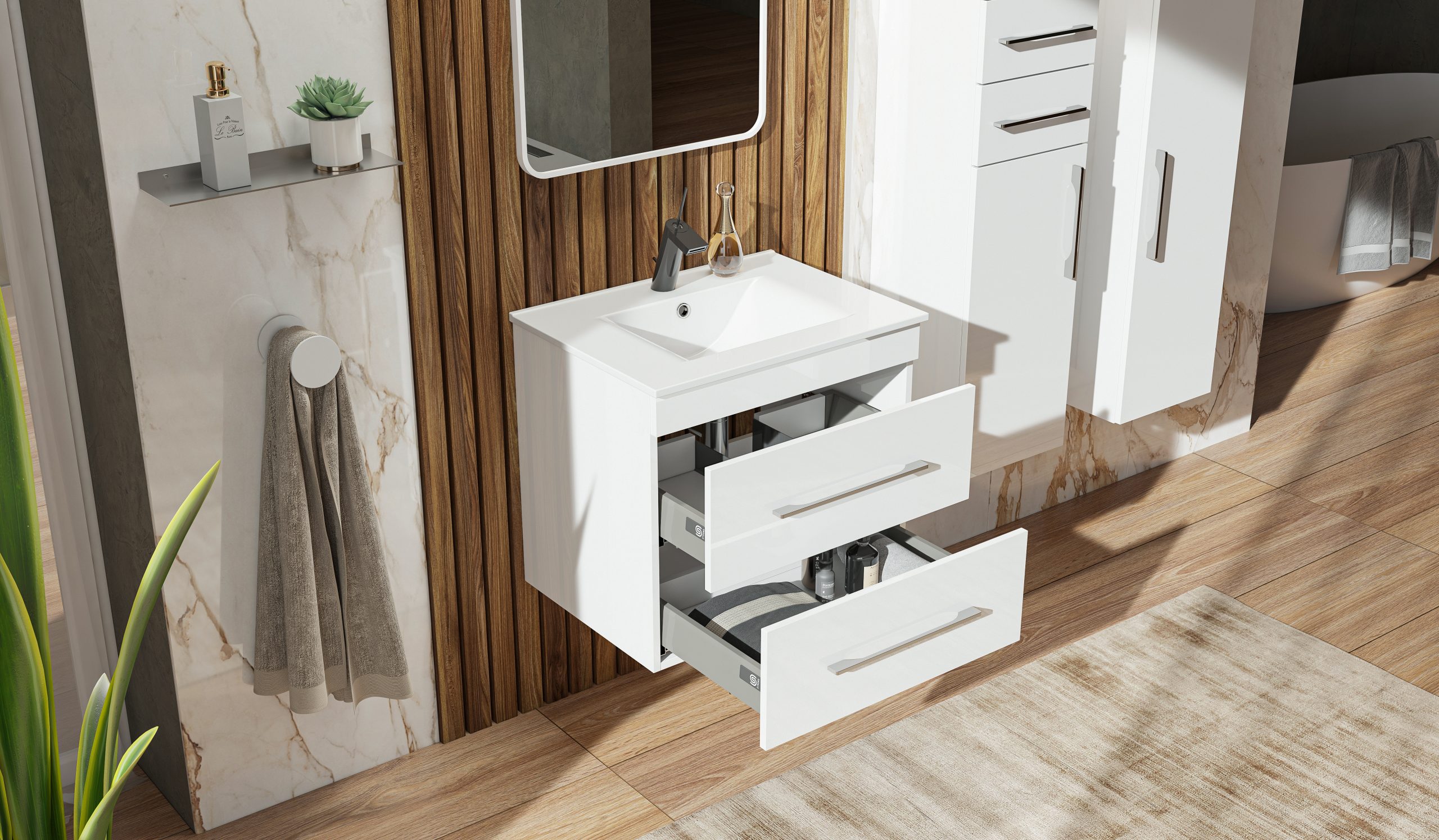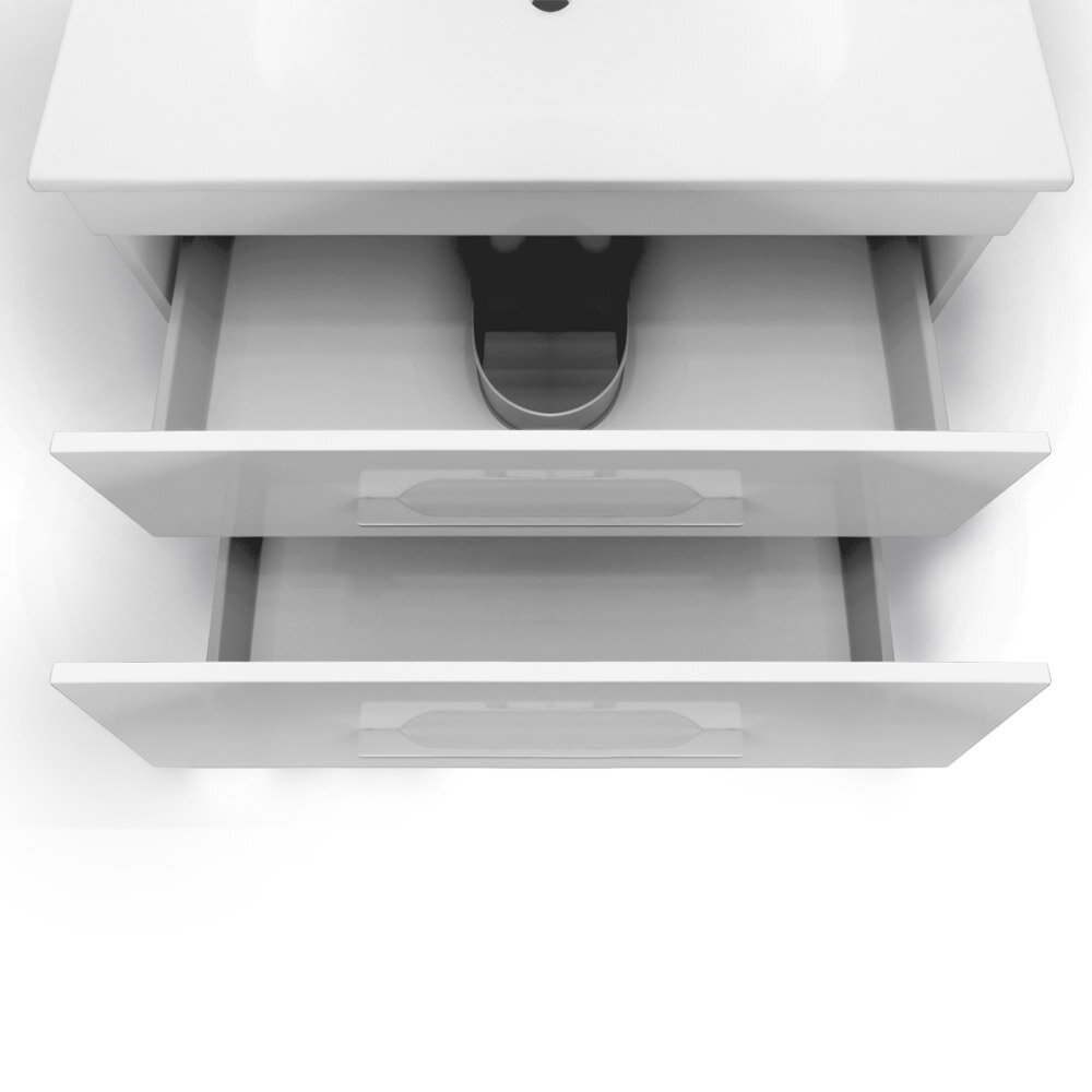 Závesná skrinka pod umývadlo s dvoma zásuvkami. Dokonale zladené tvary kúpeľňových skriniek série ENERGY2 v kombinácii s chrómovými úchytmi vytvoria očarujúcu štýlovú kúpeľňu. Kvalitné prevedenie a materiály sú zárukou dlhej životnosti. Skrinka je dodávaná zmontovaná. Dodacia lehota je 4 – 5 týždňov.