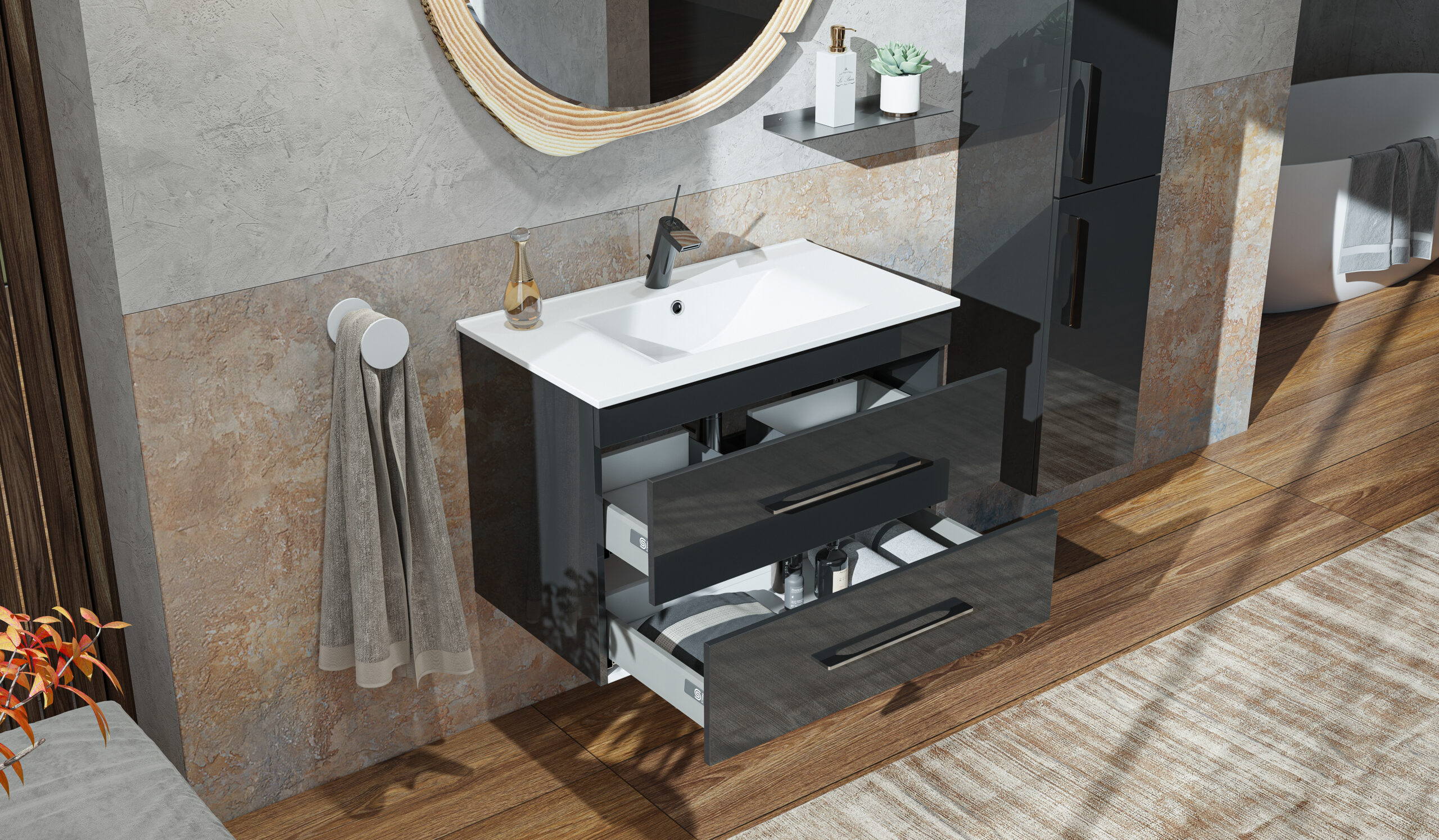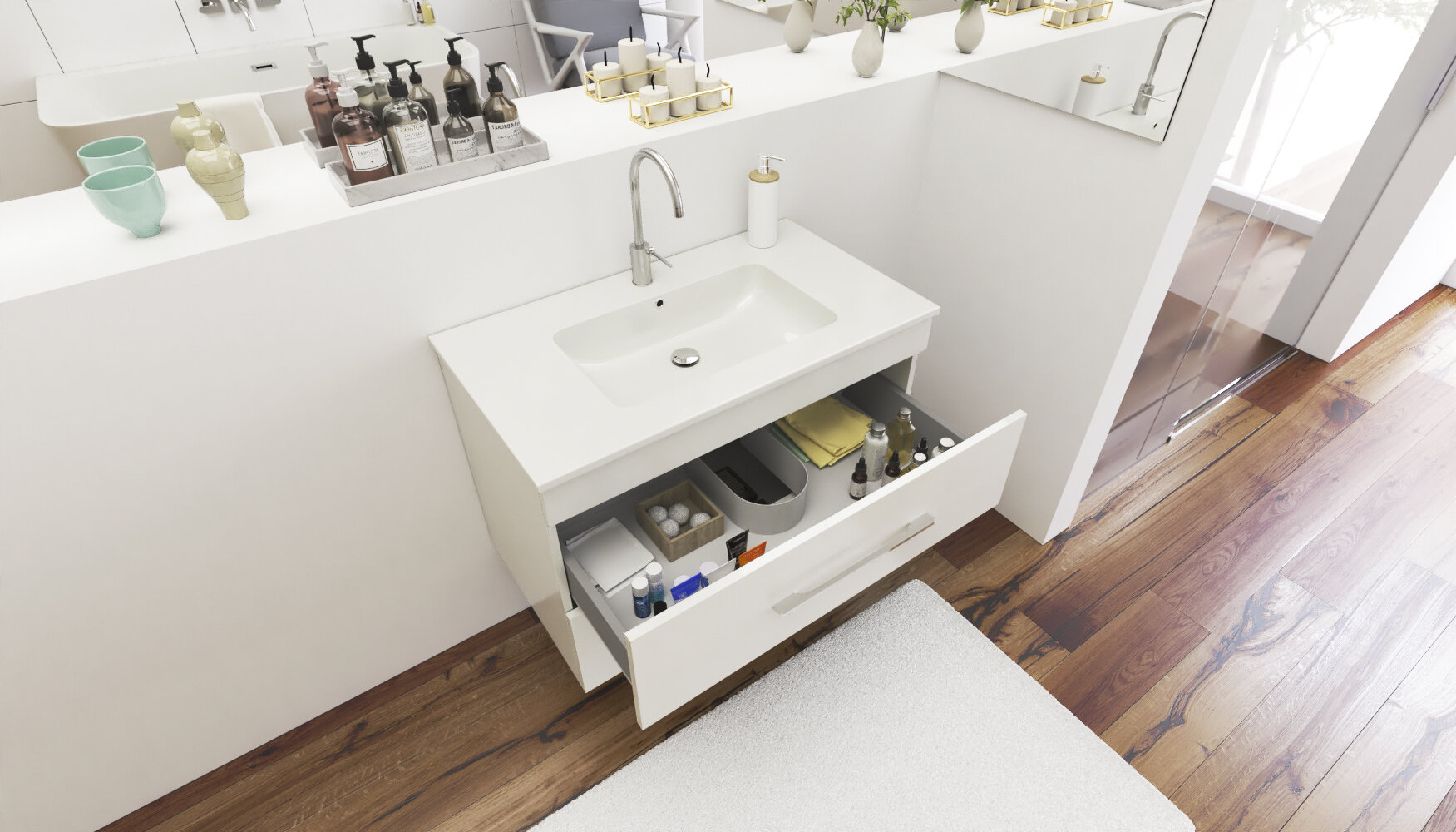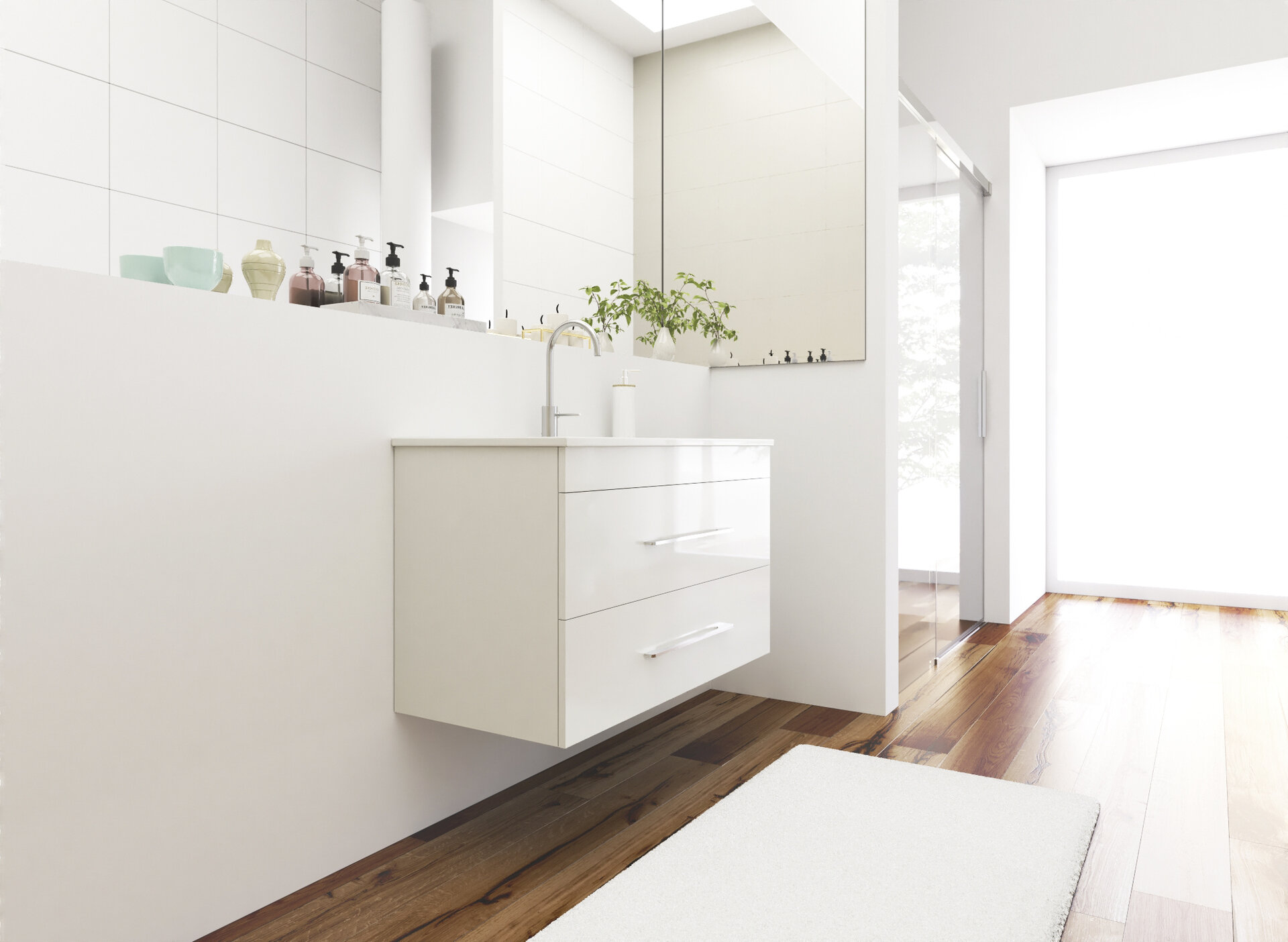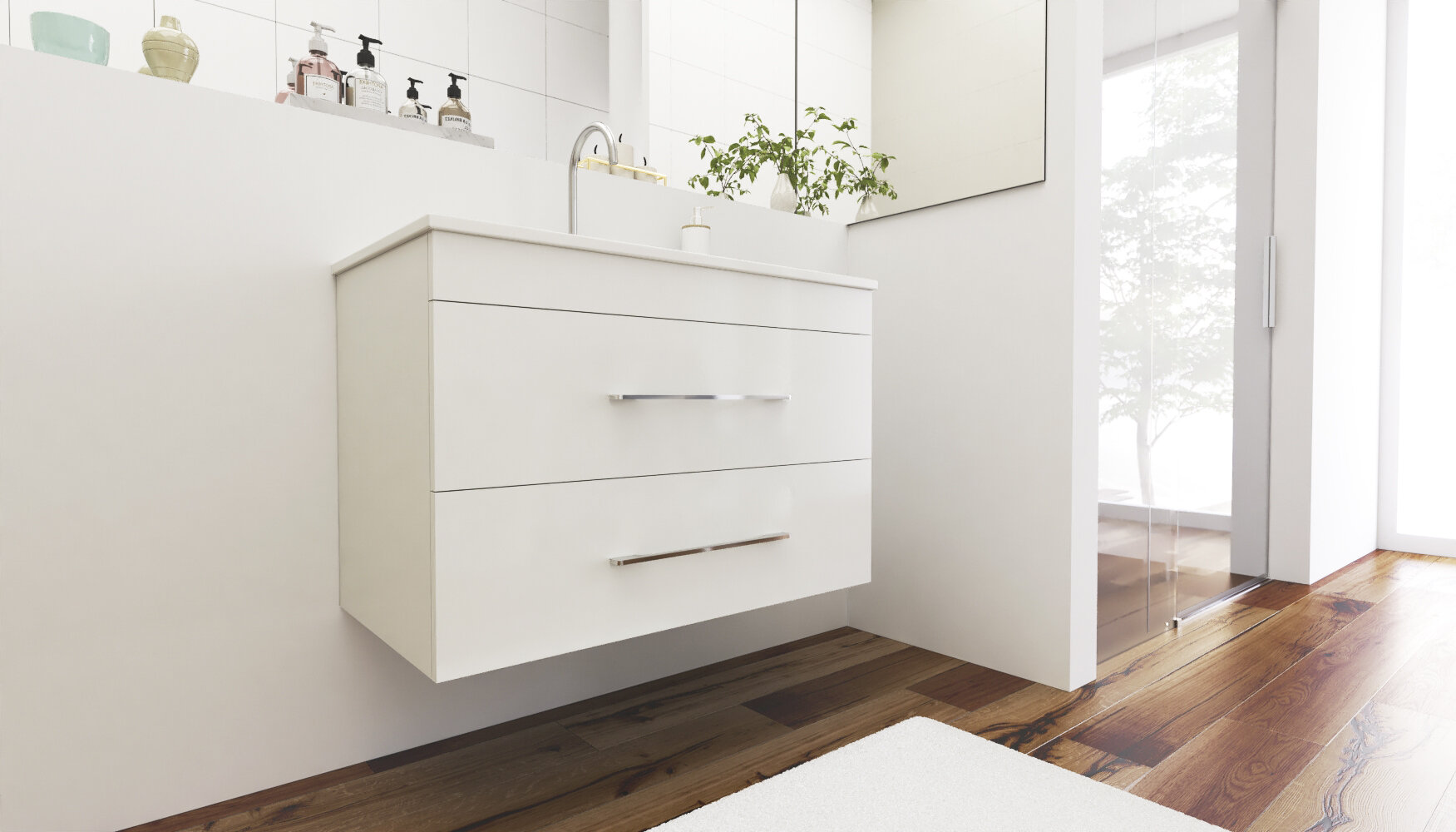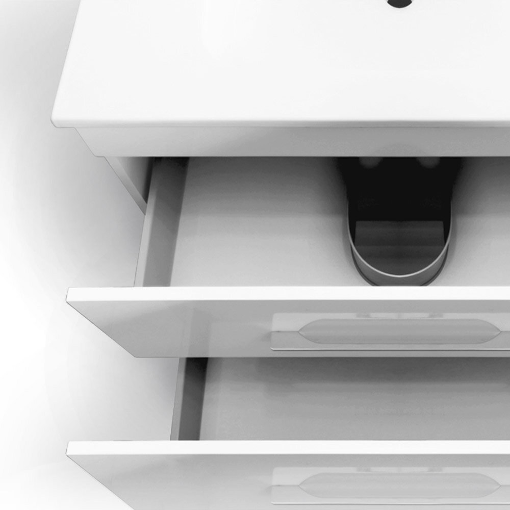 Závesná skrinka pod umývadlo s dvomi zásuvkami.