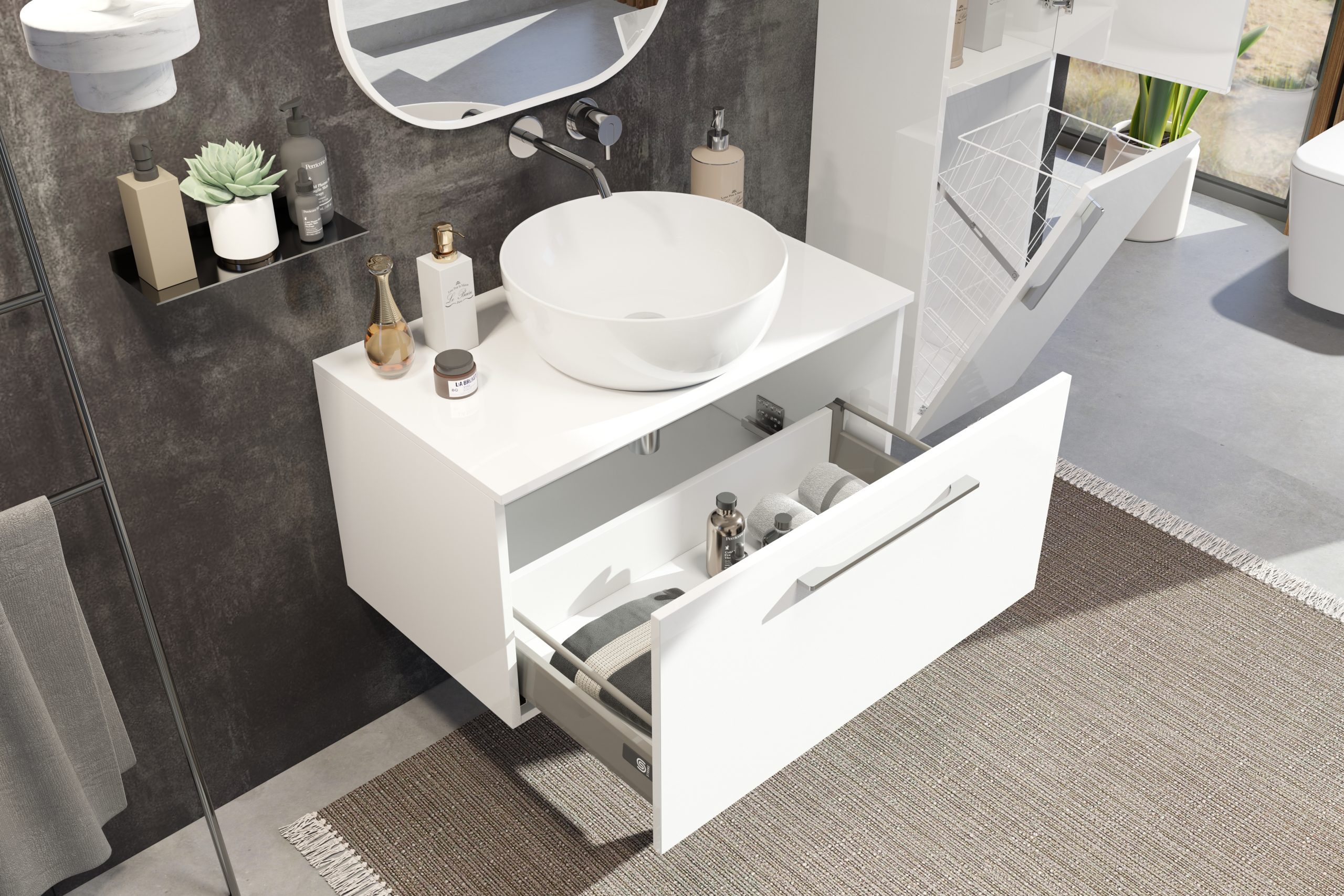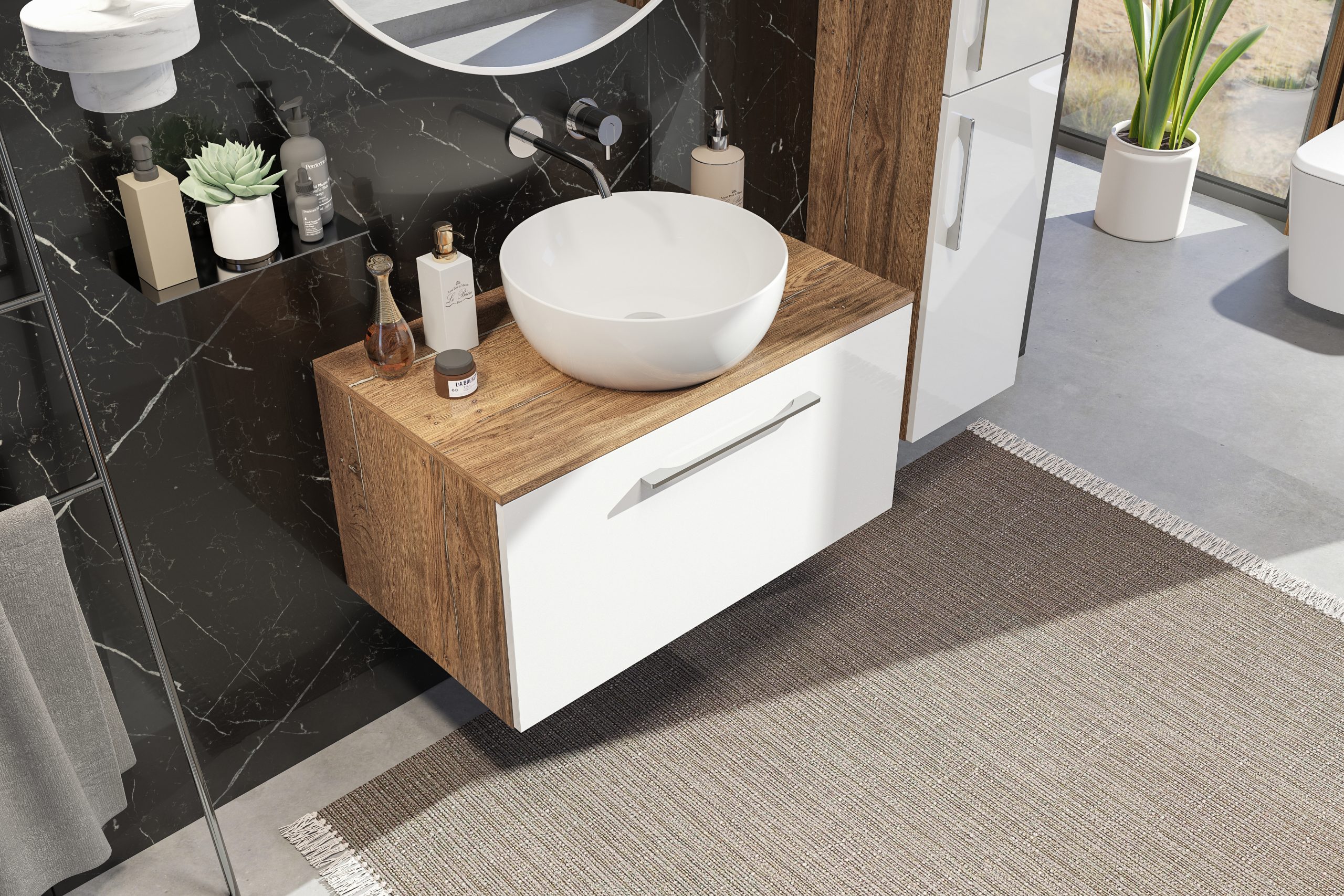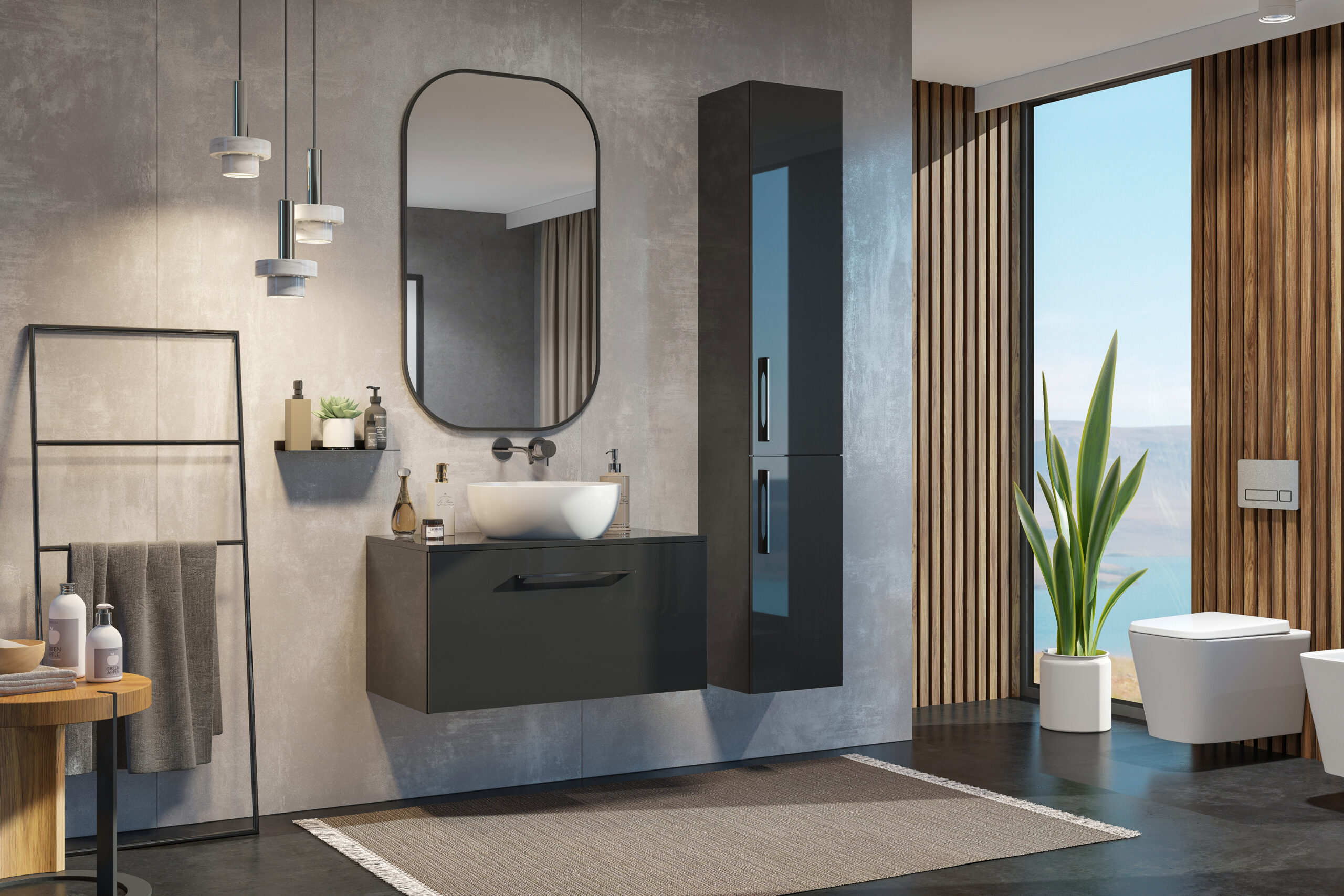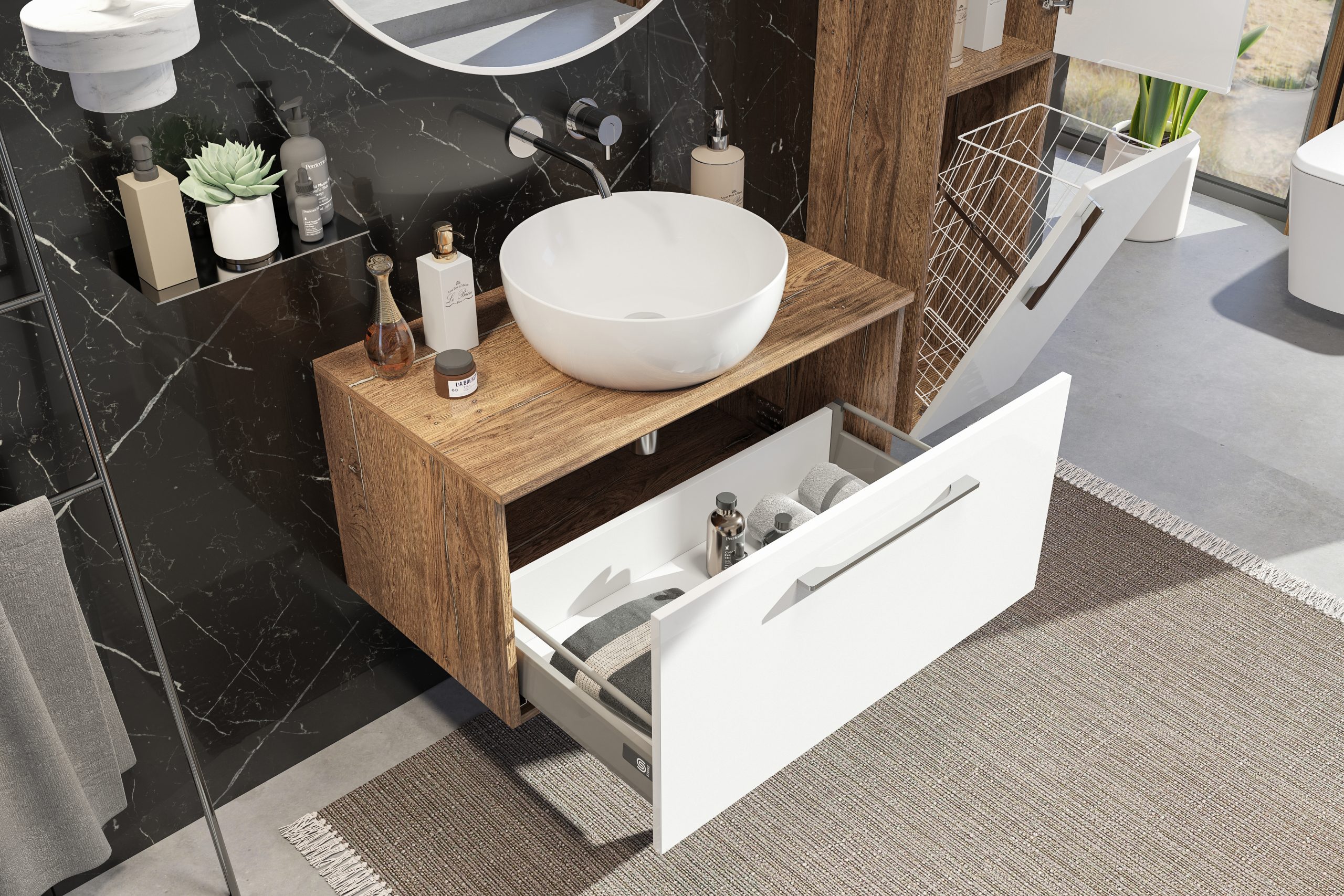 Závesná skrinka pod umývadlo s jednou zásuvkou Dokonale zladené tvary kúpeľňových skriniek série LOFT1 v kombinácii s chrómovými úchytmi vytvoria očarujúcu štýlovú kúpeľňu. Kvalitné prevedenie a materiály sú zárukou dlhej životnosti. Riešenie komponentov je premyslené tak, aby bolo praktické a zároveň moderné. Skrinka je dodávaná zmontovaná. Dodacia lehota je 4 – 5 týždňov.
