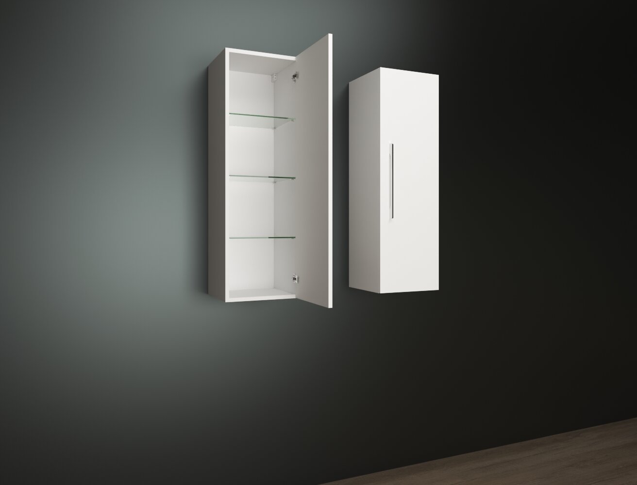 Závesná nízka kúpeľňová skrinka s jednými otváracími dvierkami