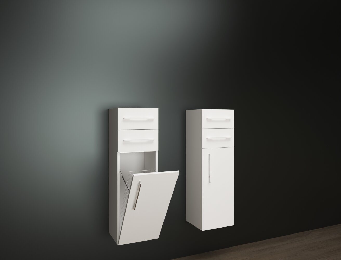 Závesná nízka kúpeľňová skrinka s dvoma zásuvkami a jednými výklopnými dvierkami s košom