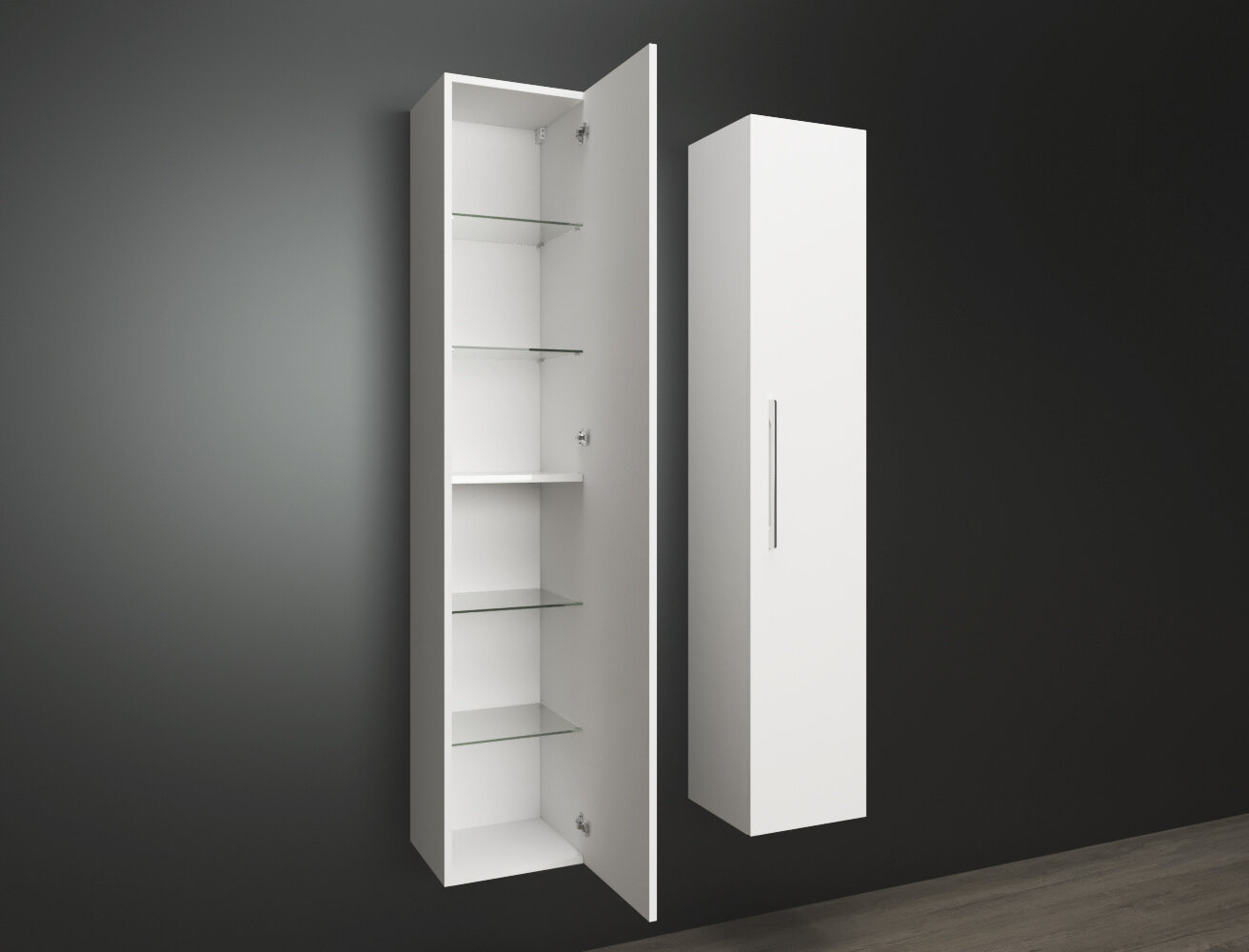 Závesná vysoká kúpeľňová skrinka s jednými otváracími dvierkami. Dokonale zladené tvary kúpeľňových skriniek série ZEN v kombinácii s chrómovými úchytmi vytvoria očarujúcu štýlovú kúpeľňu. Kvalitné prevedenie a materiály sú zárukou dlhej životnosti. Skrinka je dodávaná zmontovaná. Dodacia lehota je 4 – 5 týždňov.