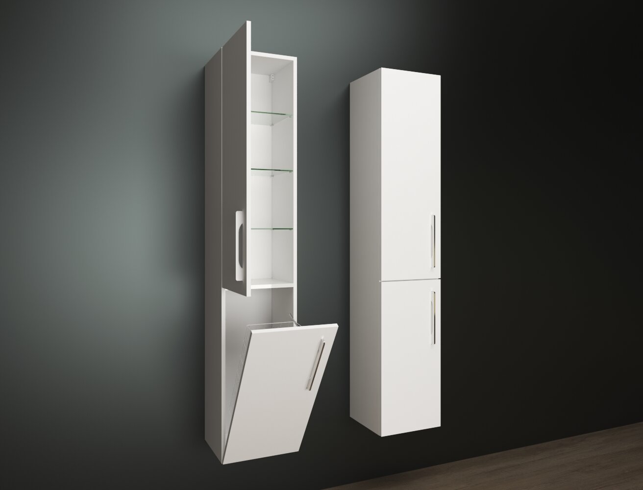 Závesná vysoká kúpeľňová skrinka s jednými otváracími dvierkami a jednými výklopnými dvierkami s košom