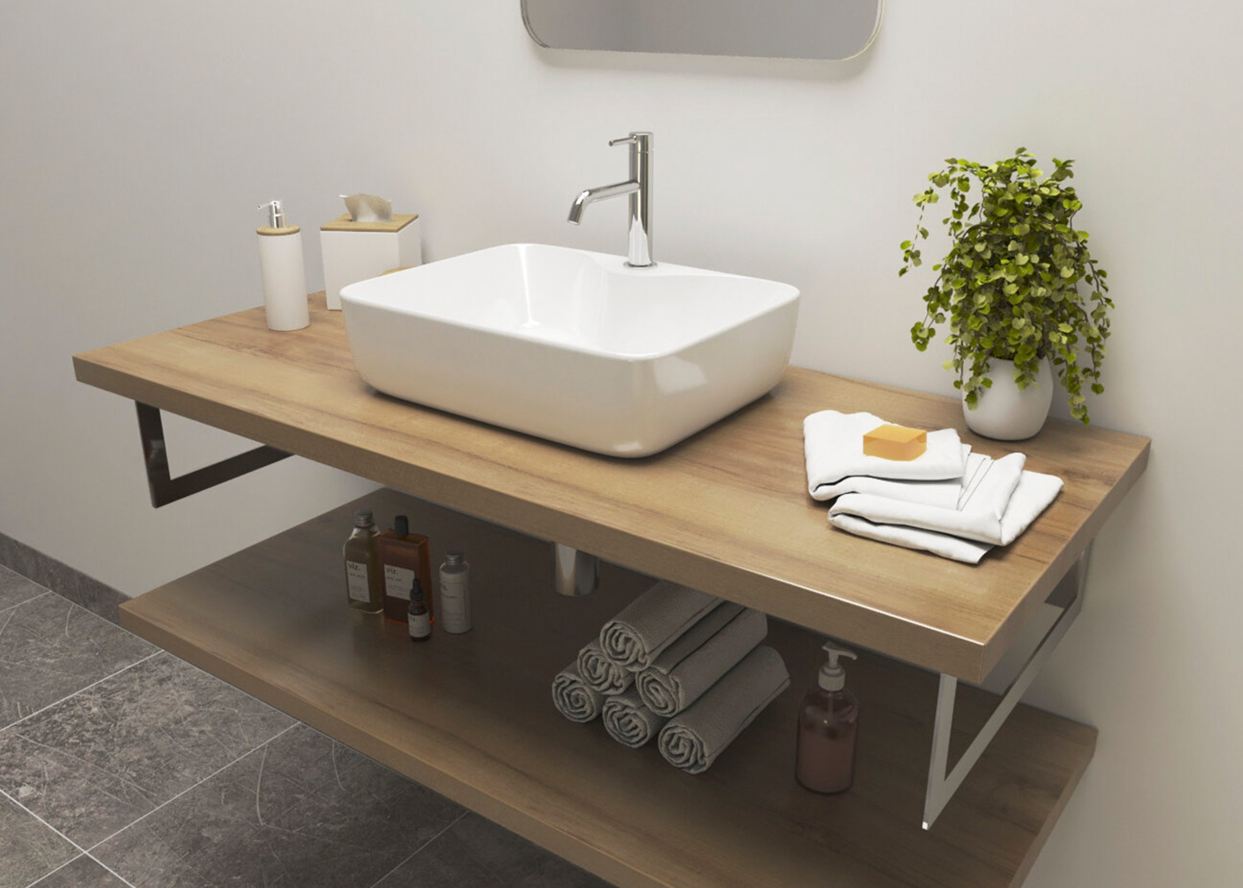 Výroba a predaj umývadlových políc na mieru. Ich základ tvorí drevotriesková doska, ktorá je impregnovaná melamínovou živicou. K dispozícii sú v rôznych povrchových úpravách, vrátane lesklej, matnej a nádhernými štruktúrami dreva.