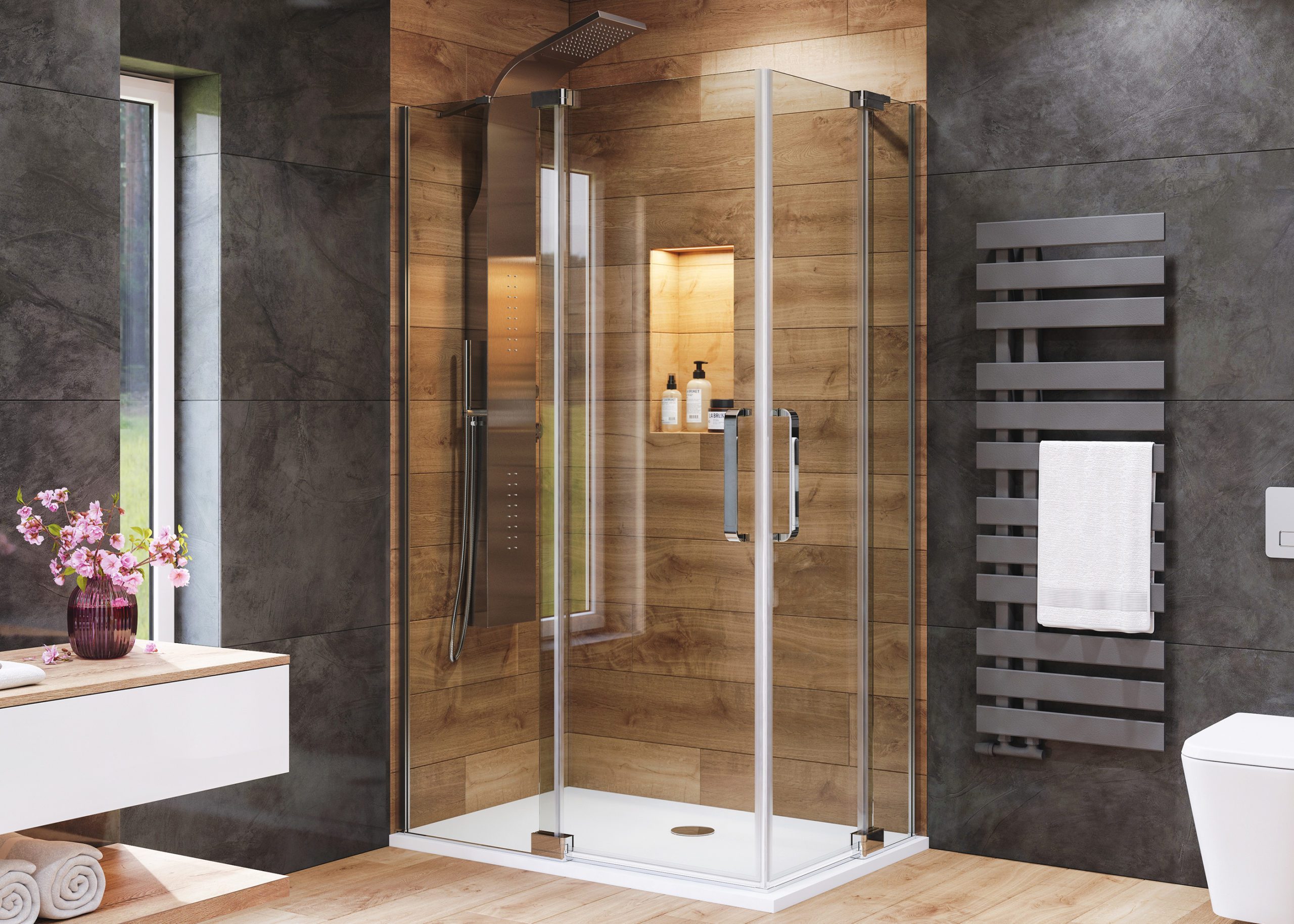 Séria posuvných sprchových kútov, dverí a zásten WELLNESS BLACK A4 sa vyznačuje najmä svojou kombinačnou variabilitou rôznych rozmerových riešení sprchovacieho priestoru. Novinkou, ktorú WELLNESS BLACK prináša je veľmi obľúbený walk-in systém, avšak s inovatívnou možnosťou posuvnej časti. Hrúbka skla 6 mm vo výške 200 cm definuje túto modelovú sériu aj z hľadiska jej priaznivej cenovej dostupnosti. Brzdiaci systém SOFT-Close pri otváraní a zatváraní dverí je neopomenuteľnou praktickou výhodou. Sklenené plochy sú ošetrené impregnačnou vrstvou antiplakovej úpravy Tekno.cal zjednodušujúcu ich pravidelnú údržbu.