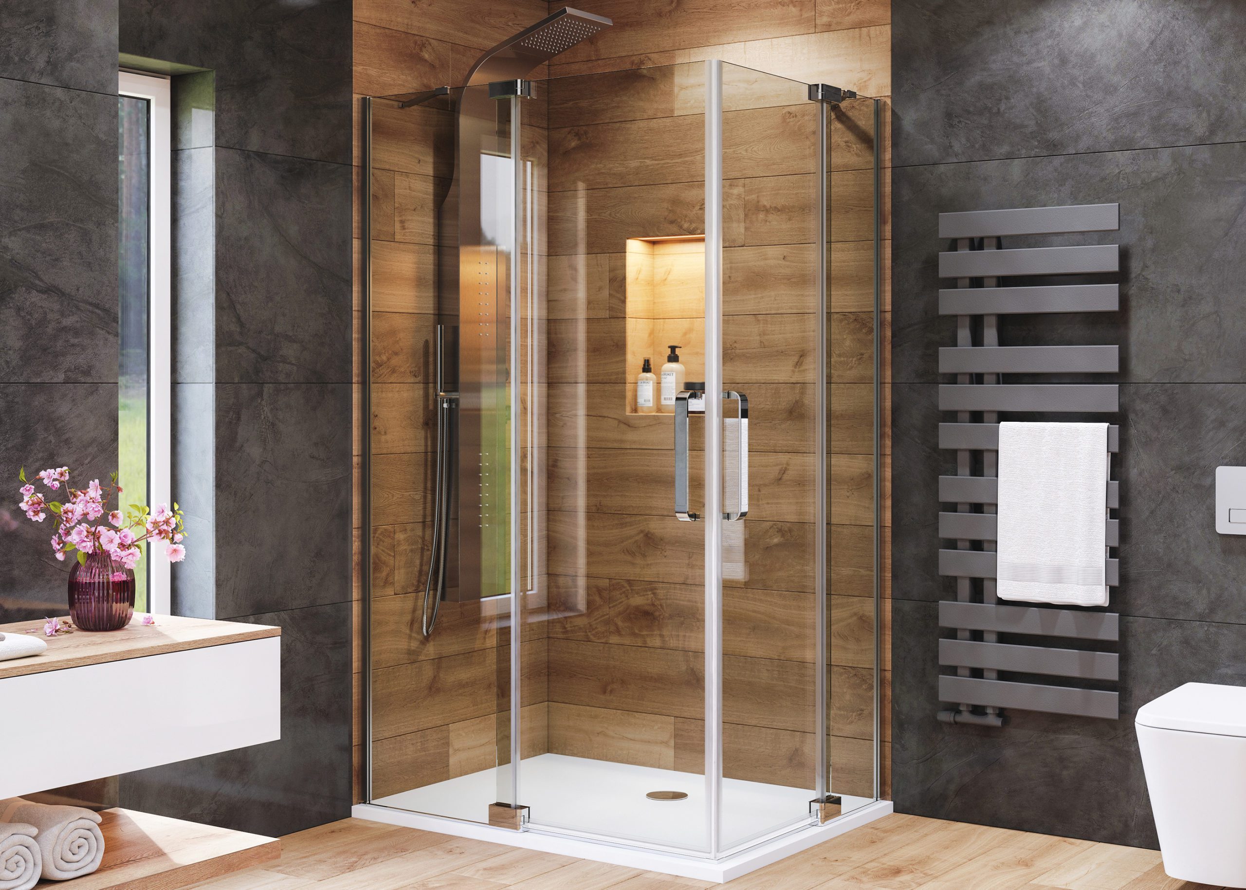 Sprchové kúty série PARTY R34 s dvomi otváracími dverami na pánty. Kalené sklo s antiplakovou povrchovou úpravou proti usádzaniu vodného kameňa – TEKNO.CAL. Samozrejmosťou je vyšší štandard hrúbky bezpečnostného skla – až 8 mm a celková výška 195 cm. Magnetické uzatváranie dverí, chrómová podlahová lišta, vyrovnávací profil s 2 cm roztiahnutím a farba kovových častí v chróme. Čisté plochy kaleného skla v kombinácií s chrómovými časťami pántov a doplnkov, sú tie najlepšie vlastnosti prevedenia kvalitného sprchovacieho kútu.