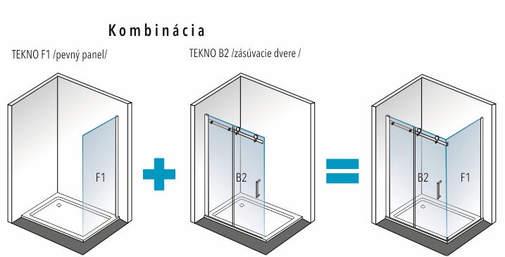 Pri kombinácii TEKNO B2 + TEKNO F1 je potrebné zakúpiť dvere TEKNO B2 o 5 cm väčšie ako je požadovaný rozmer. Rozmer pevnej steny TEKNO F1 sa nemení.