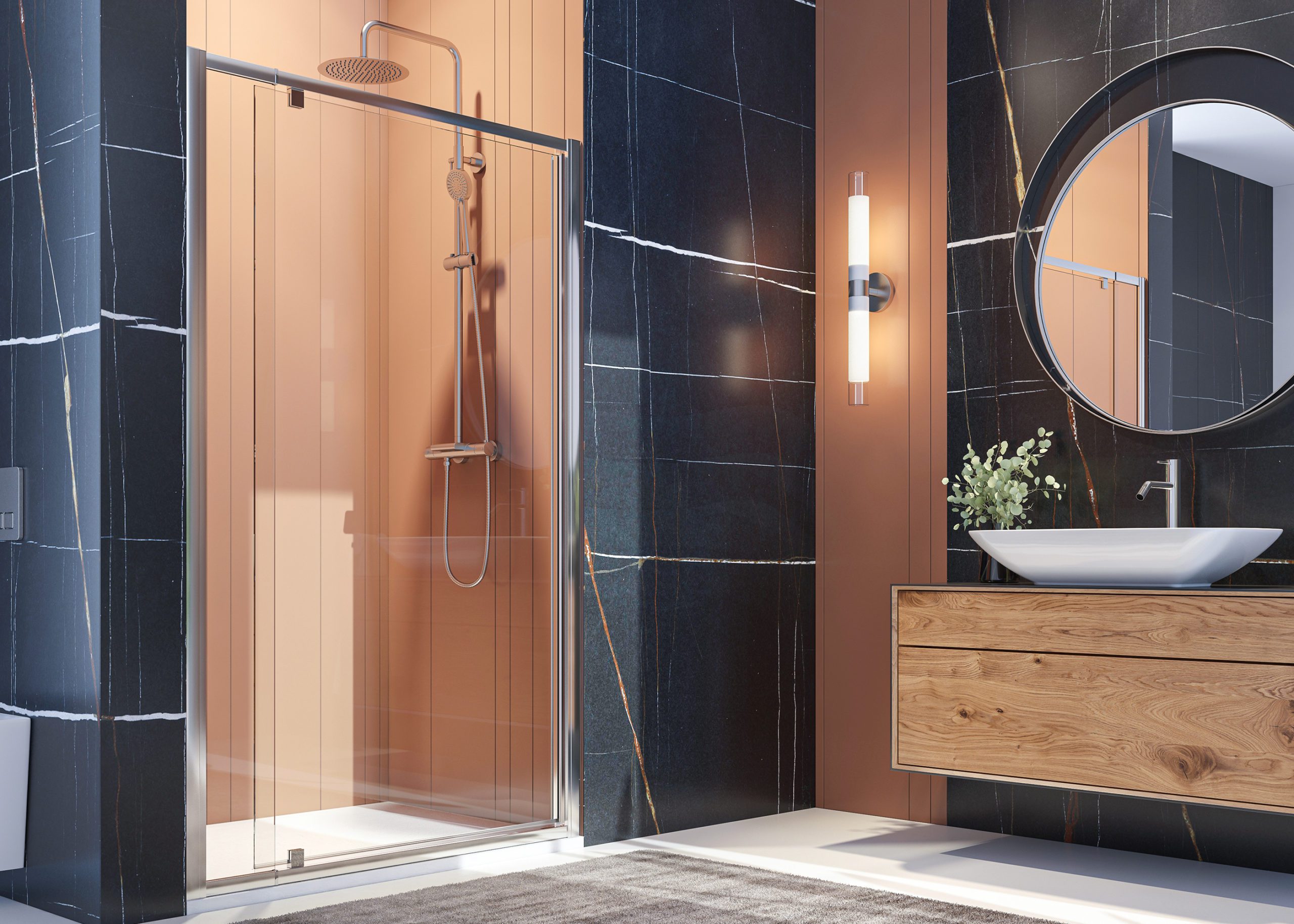 Séria posuvných sprchových kútov, dverí a zásten WELLNESS BLACK A4 sa vyznačuje najmä svojou kombinačnou variabilitou rôznych rozmerových riešení sprchovacieho priestoru. Novinkou, ktorú WELLNESS BLACK prináša je veľmi obľúbený walk-in systém, avšak s inovatívnou možnosťou posuvnej časti. Hrúbka skla 6 mm vo výške 200 cm definuje túto modelovú sériu aj z hľadiska jej priaznivej cenovej dostupnosti. Brzdiaci systém SOFT-Close pri otváraní a zatváraní dverí je neopomenuteľnou praktickou výhodou. Sklenené plochy sú ošetrené impregnačnou vrstvou antiplakovej úpravy Tekno.cal zjednodušujúcu ich pravidelnú údržbu.