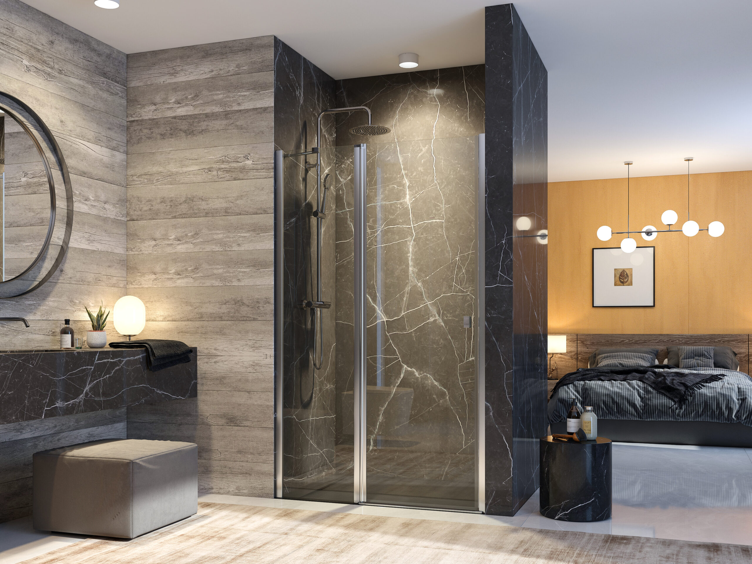 Sprchové dvere GLASS B5 s jednými otváracími dverami na pánty. Dizajnové spojenie skla a kovu, otváranie a zatváranie zdvíhacími pántami rafinovane ukrytých vo zvislých hliníkových profiloch. V dostupnosti výplne v čírom skle v hrúbke 6 mm a výške 195 cm s farbou hliníkových profilov v chróme. Dilatačný zvislý kotviaci profil s 2 cm roztiahnutím pre ľahkú montáž, magnetické a spodné tesnenia, ako aj podlahová lišta sú štandardnou výbavou.