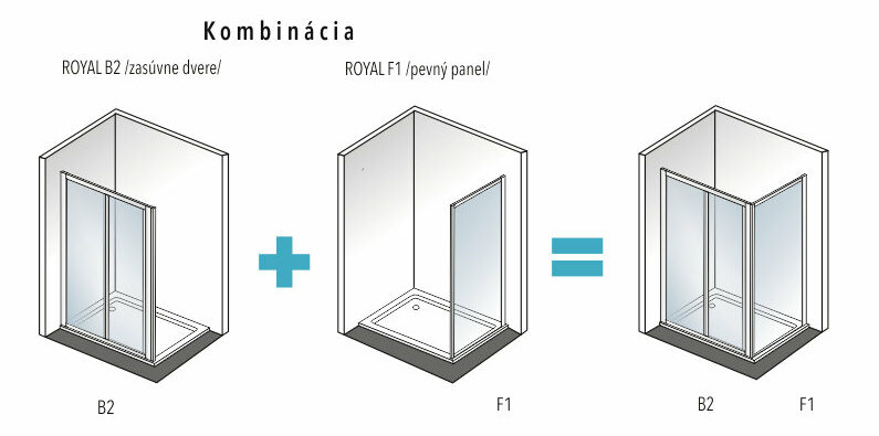 Sprchové dvere ROYAL B2 s jednými zásuvnými dverami. Kvalitné hrubé hliníkové profily bielej farby, špeciálne tepelne upravované a striekané. Plastová výplň (krilex) o hrúbke 2,2 mm vo vzore stekajúcej vody. Štandardná výška 185 cm. Plynulé zasúvanie dverí pomocou špeciálnych plastových komponentov (plastových háčikov). Vyrovnávací bočný profil až s 2,5 cm roztiahnutím a magnetické uzatváranie. Jednoduchá montáž a nenáročná údržba.