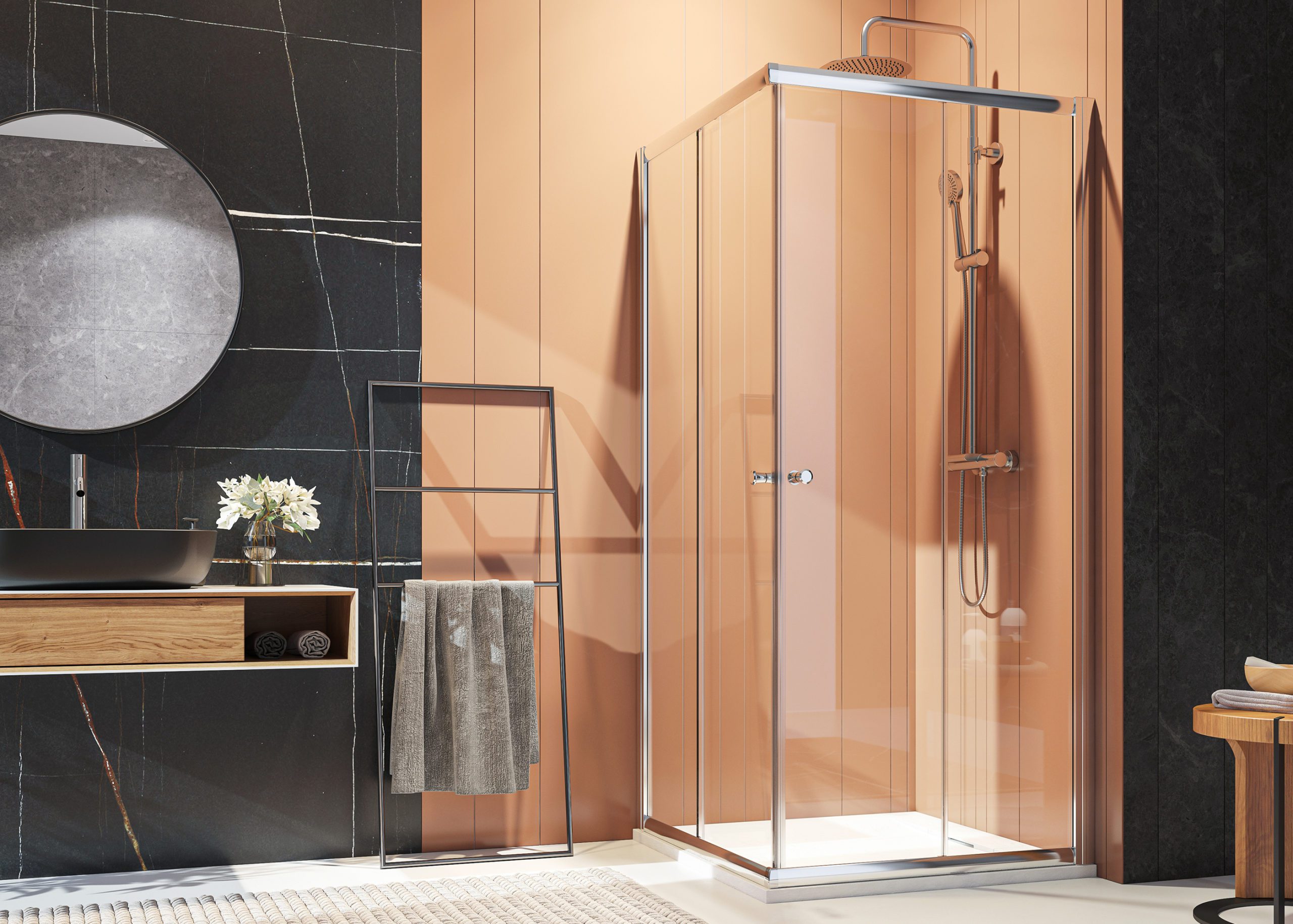Séria posuvných sprchových kútov, dverí a zásten WELLNESS BLACK A4 sa vyznačuje najmä svojou kombinačnou variabilitou rôznych rozmerových riešení sprchovacieho priestoru. Novinkou, ktorú WELLNESS BLACK prináša je veľmi obľúbený walk-in systém, avšak s inovatívnou možnosťou posuvnej časti. Hrúbka skla 6 mm vo výške 200 cm definuje túto modelovú sériu aj z hľadiska jej priaznivej cenovej dostupnosti. Brzdiaci systém SOFT-Close pri otváraní a zatváraní dverí je neopomenuteľnou praktickou výhodou. Sklenené plochy sú ošetrené impregnačnou vrstvou antiplakovej úpravy Tekno.cal zjednodušujúcu ich pravidelnú údržbu.