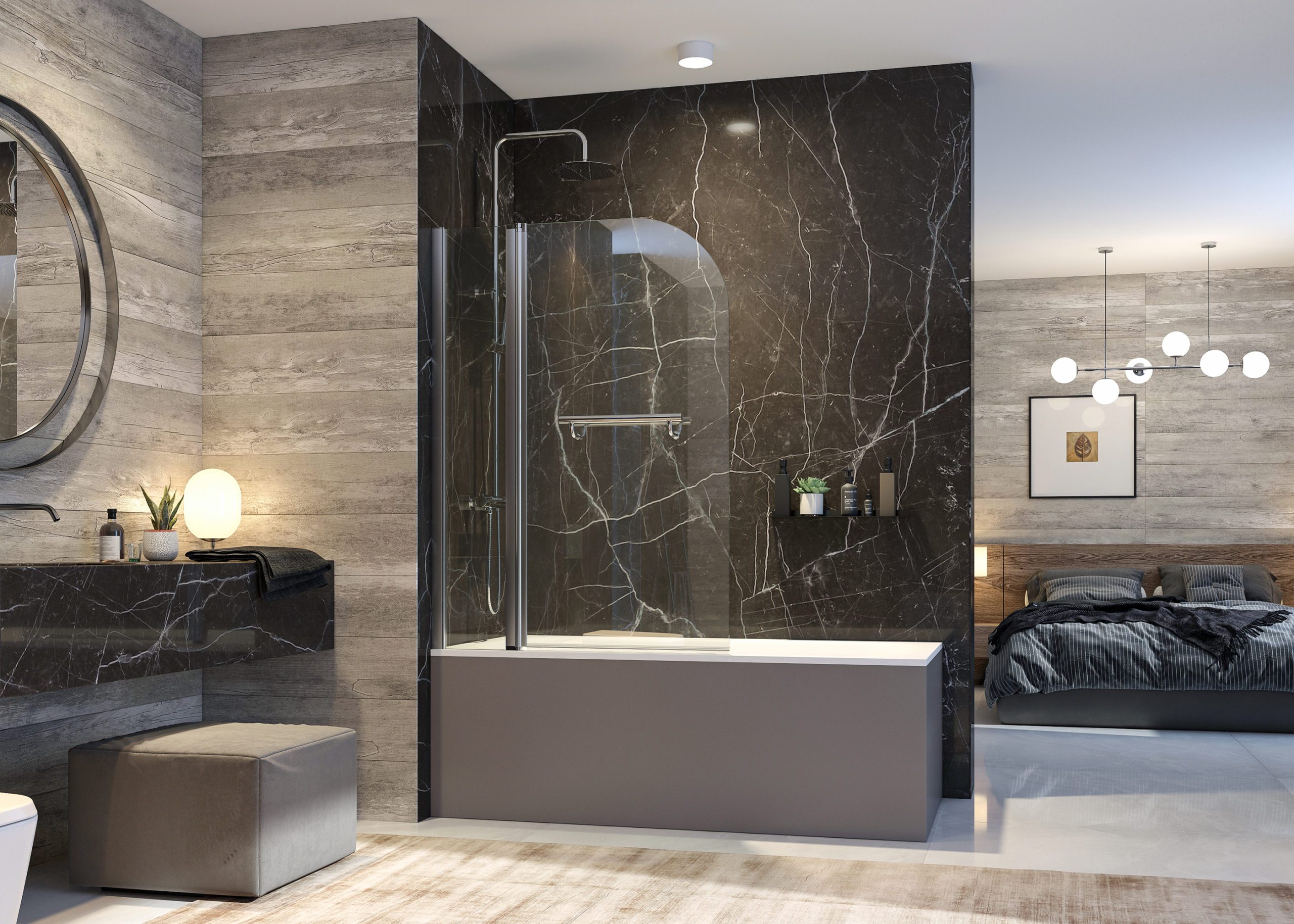 Vaňová zástena GLASS L2 s pántom otočným o 180°. Dizajnové spojenie skla a kovu s efektným a navyše praktickým vodorovným madlom. V dostupnosti výplní v skle čírom alebo nepriehľadnom skle frost v hrúbke 6 mm a štandardnej výške 140 cm. Farba hliníkových profilov v chróme.