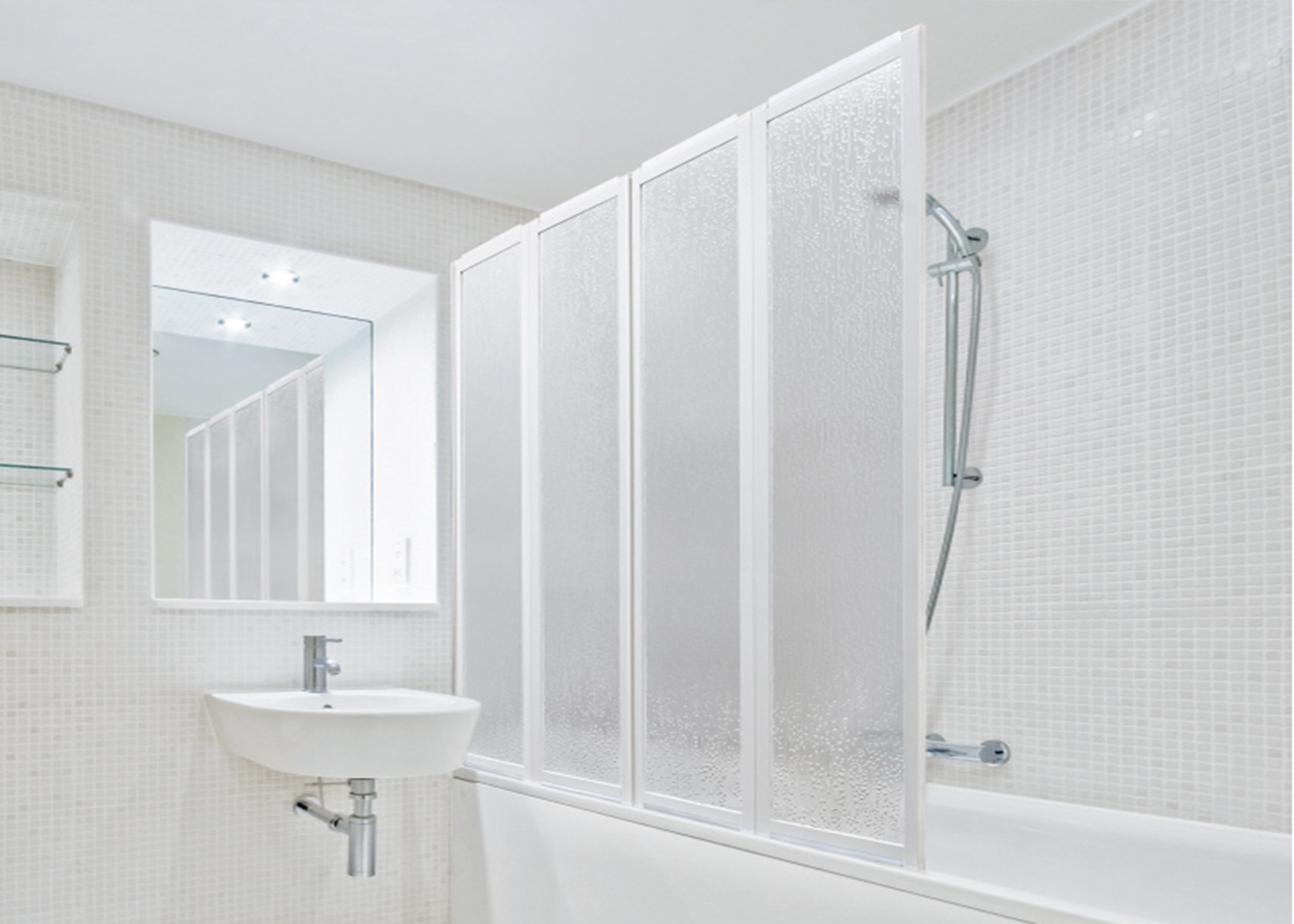 Vaňová zástena LUX L4. Všetky modely sú vyrábané v plastovej výplni – vzor stekajúca voda o hrúbke 2,2 mm orámované hliníkovými profilmi bielej farby. Uvedená séria sa vyznačuje otváraním alebo sklápaním prostredníctvom pántov umiestnených vo vertikálnych profiloch. Dvierka sa montujú čo najbližšie k vnútornej hrane vane, vaničky alebo múrika, pretože nemajú žiadny spodný vodiaci profil a tesnosť je zabezpečená iba vďaka gumenému tesneniu na spodnej strane dvierok. Výška 140 cm.