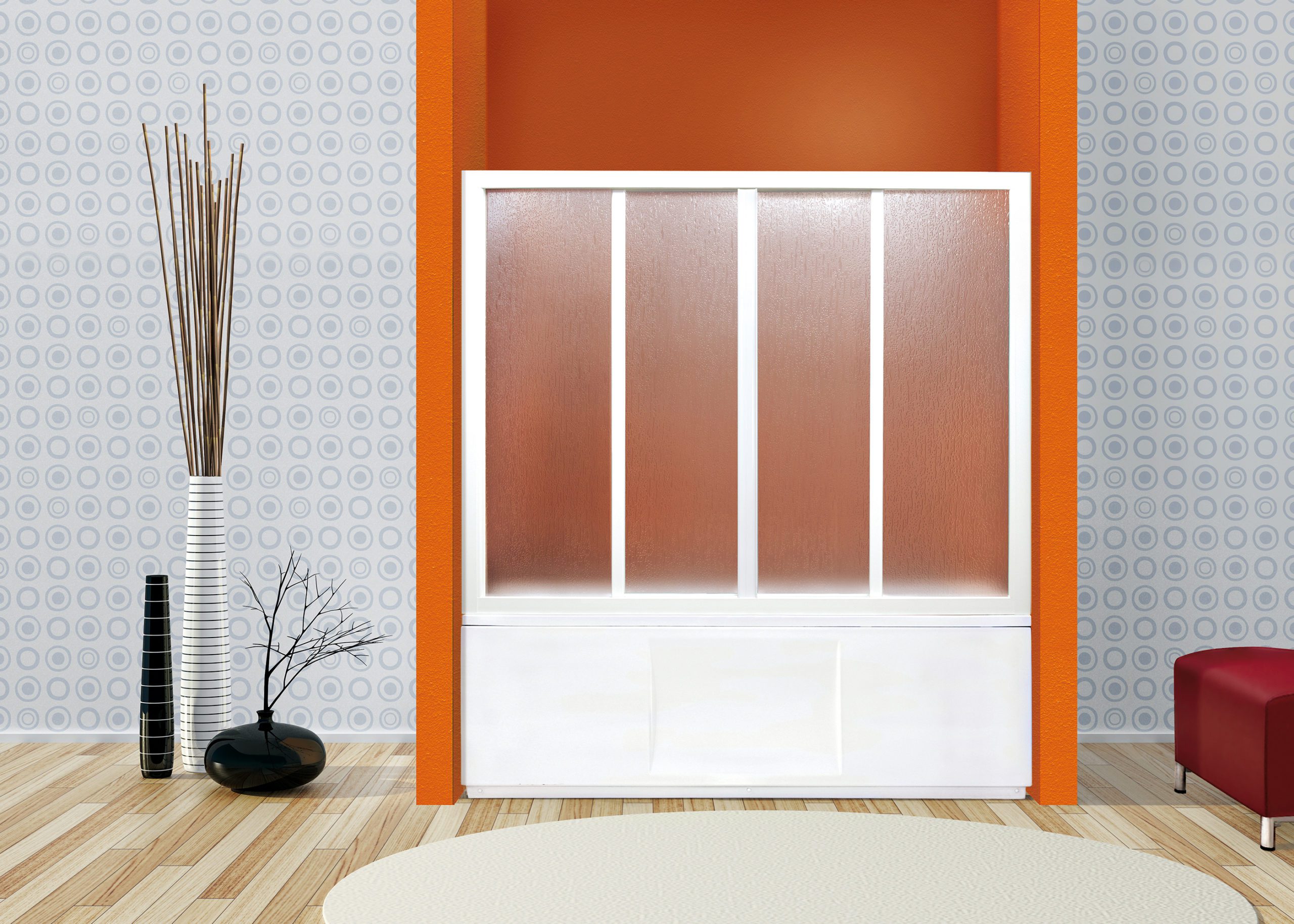 Zasúvacie dvere nad vaňu ROYAL V4. Kvalitné hrubé hliníkové profily bielej farby, špeciálne tepelne upravované a striekané. Plastová výplň o hrúbke 2,2 mm (krilex) vo vzore stekajúcej vody. Výška 140 cm. Plynulé zasúvanie dverí vaňovej zásteny pomocou špeciálnych plastových komponentov (plastových háčikov). Vyrovnávací bočný profil až s 2,5 cm roztiahnutím a magnetické uzatváranie. Jednoduchá montáž a nenáročná údržba.