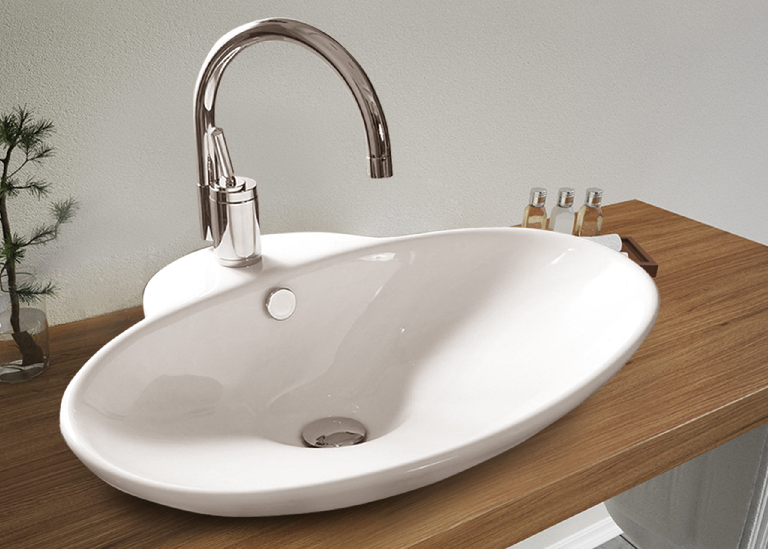 Atypické keramické umývadlo bez otvoru pre batériu, bez prepadu.