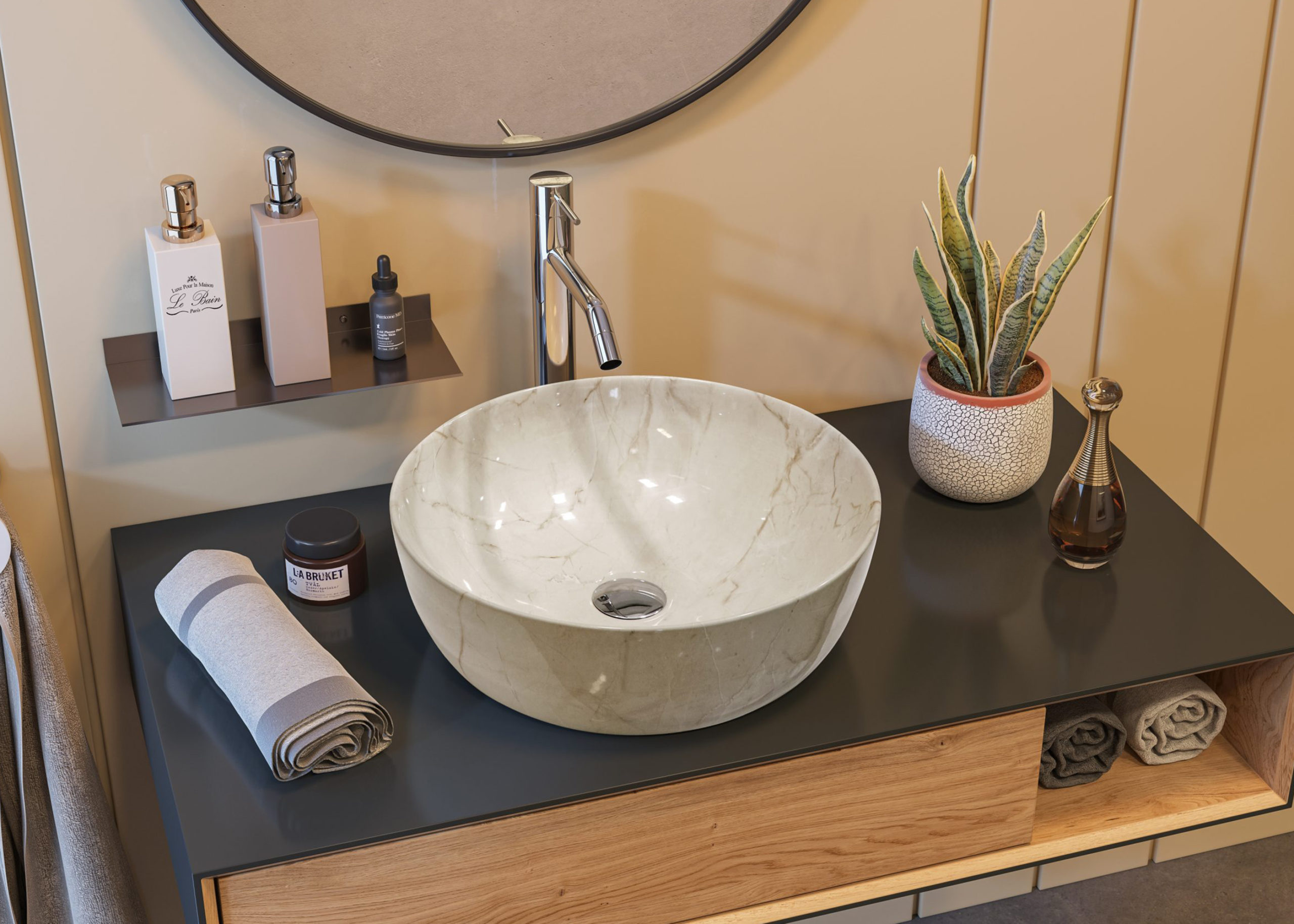 Kruhové keramické umývadlo bez otvoru pre batériu, bez prepadu.