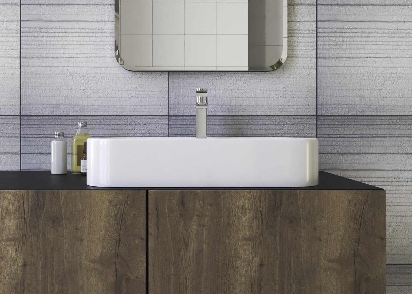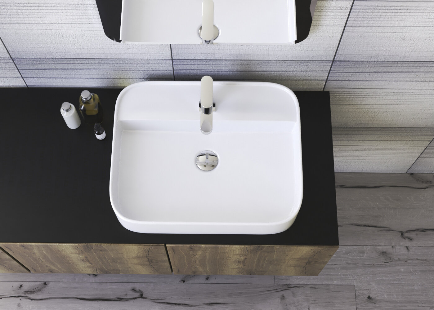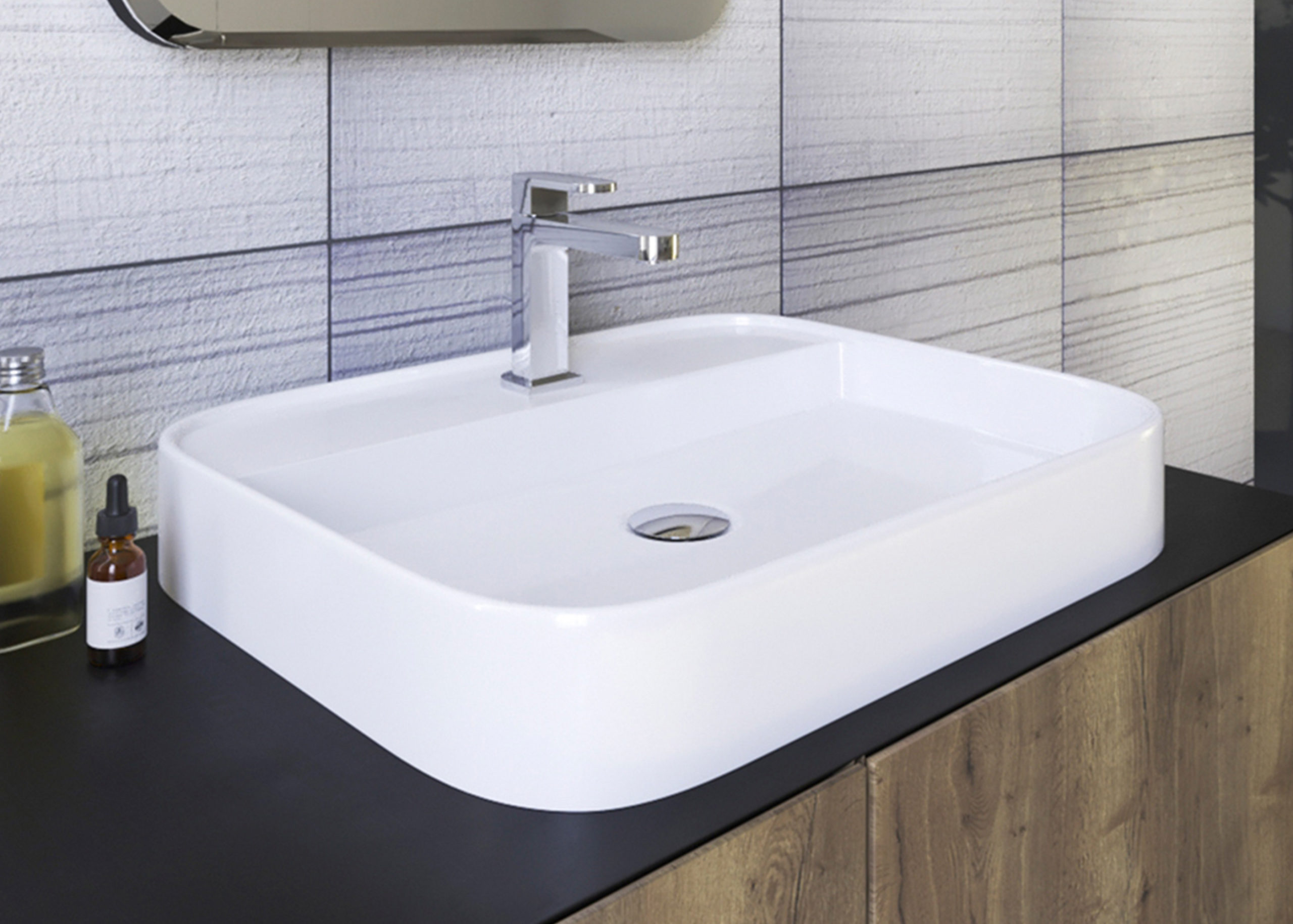 Obdĺžnikové keramické umývadlo so zaoblenými rohmi bez otvoru pre batériu, bez prepadu.