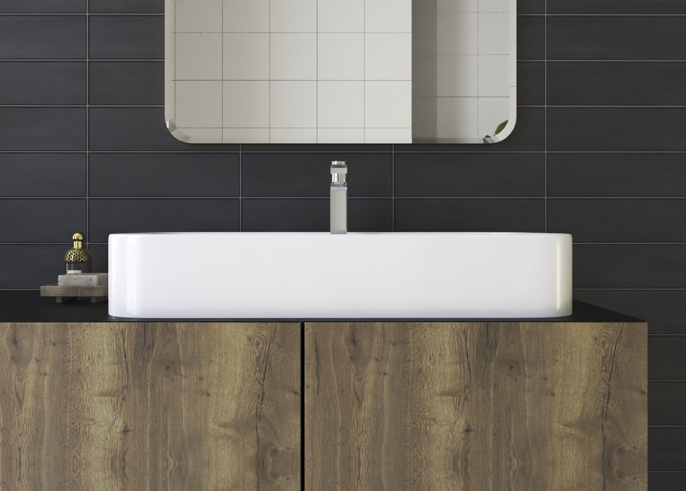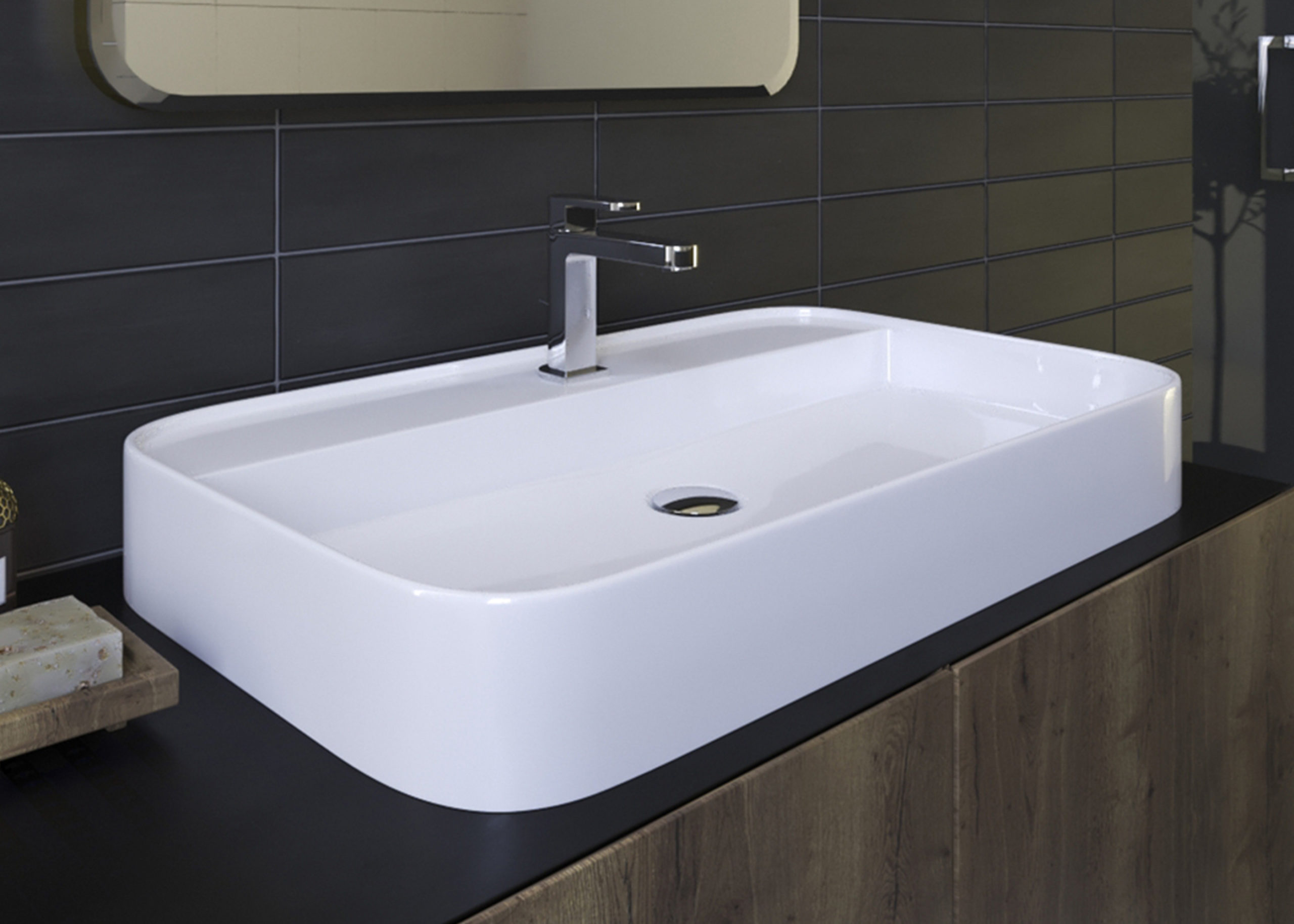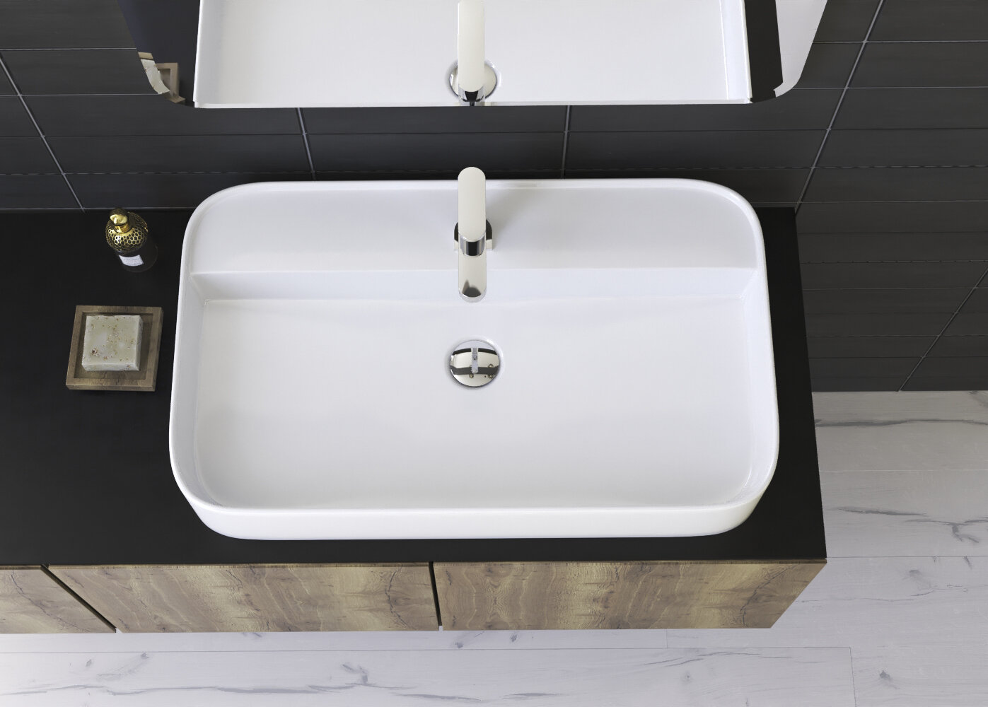 Obdĺžnikové keramické umývadlo so zaoblenými rohmi bez otvoru pre batériu, bez prepadu.