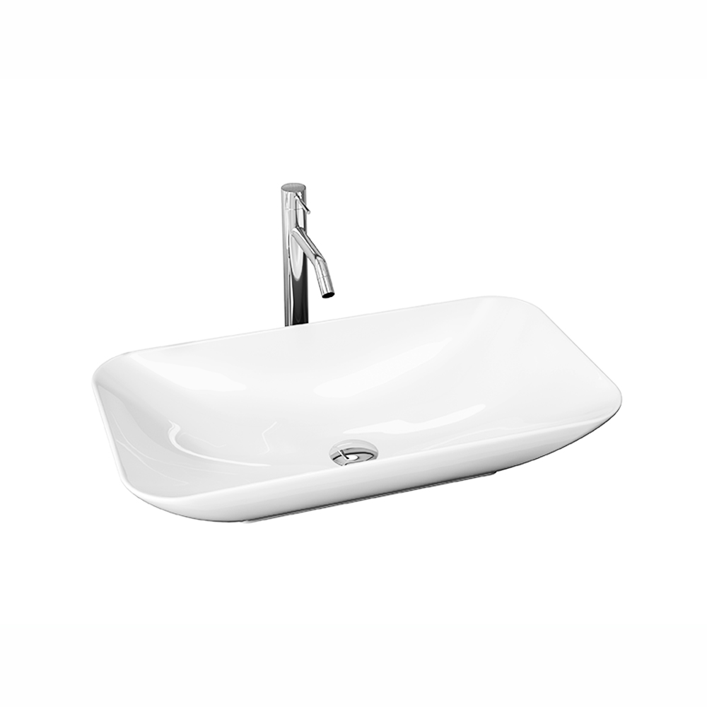 Obdĺžnikové keramické umývadlo so zaoblenými rohmi bez otvoru pre batériu, bez prepadu.