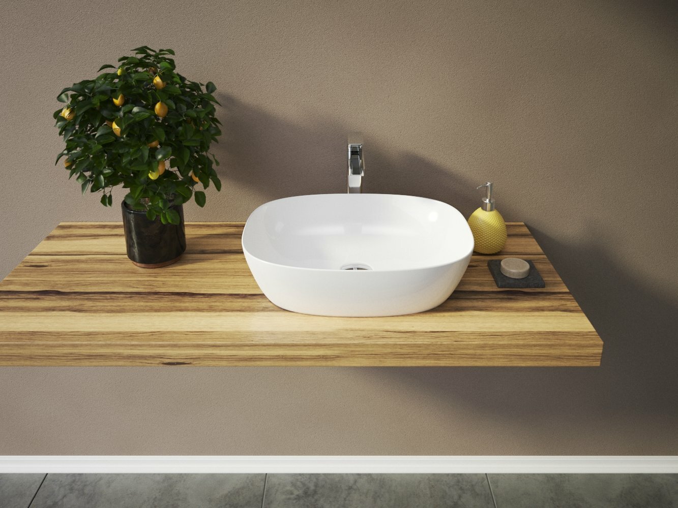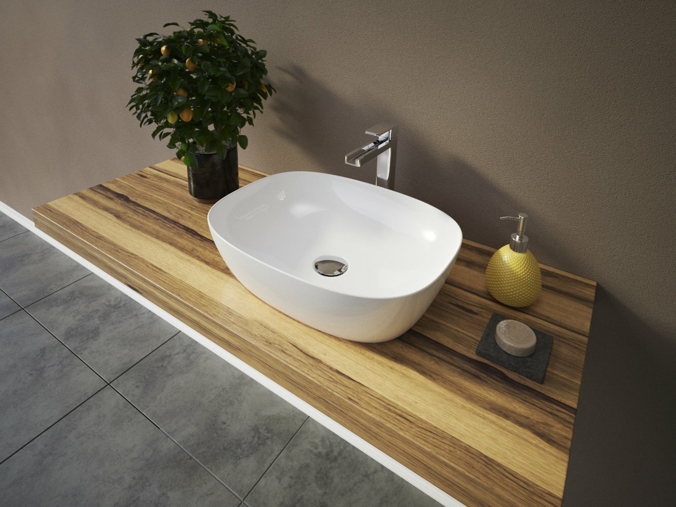 Obdĺžnikové keramické umývadlo so zaoblenými rohmi bez otvoru pre batériu, bez prepadu.