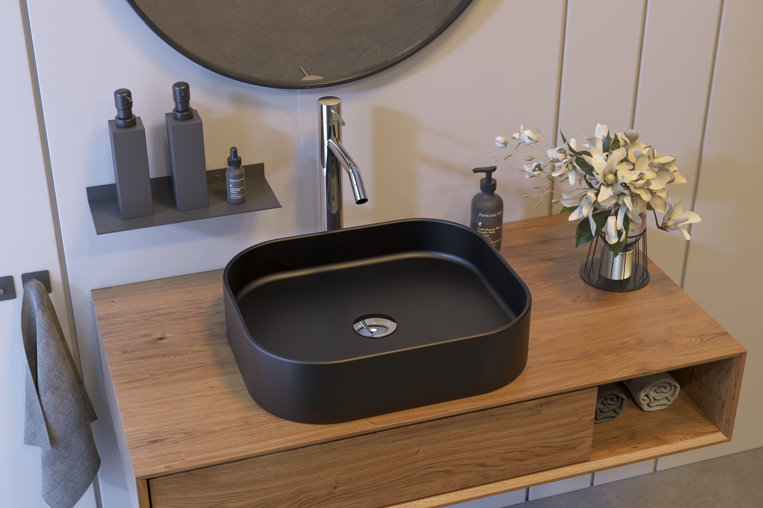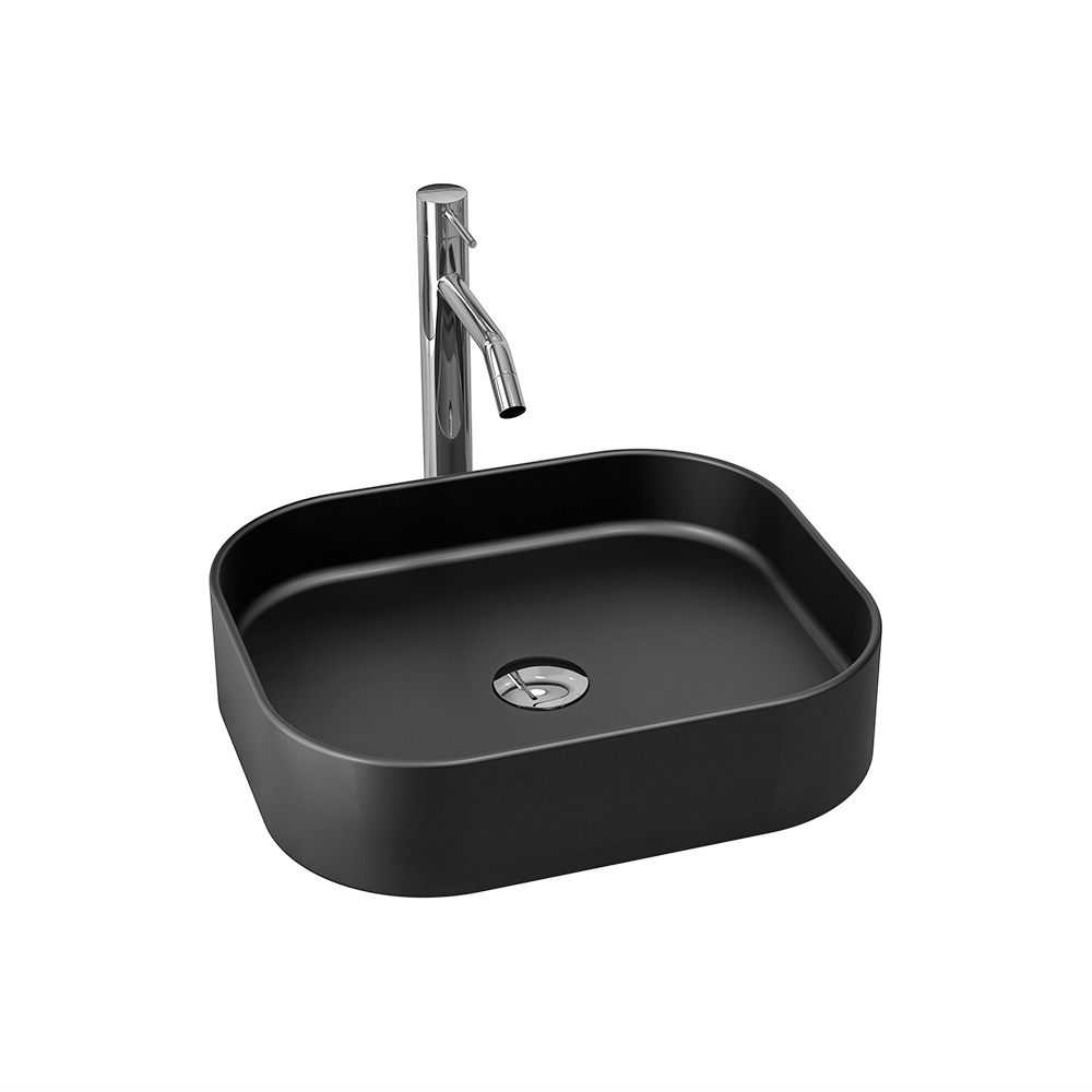 Obdĺžnikové keramické umývadlo so zaoblenými rohmi bez otvorom pre batériu, bez prepadu.