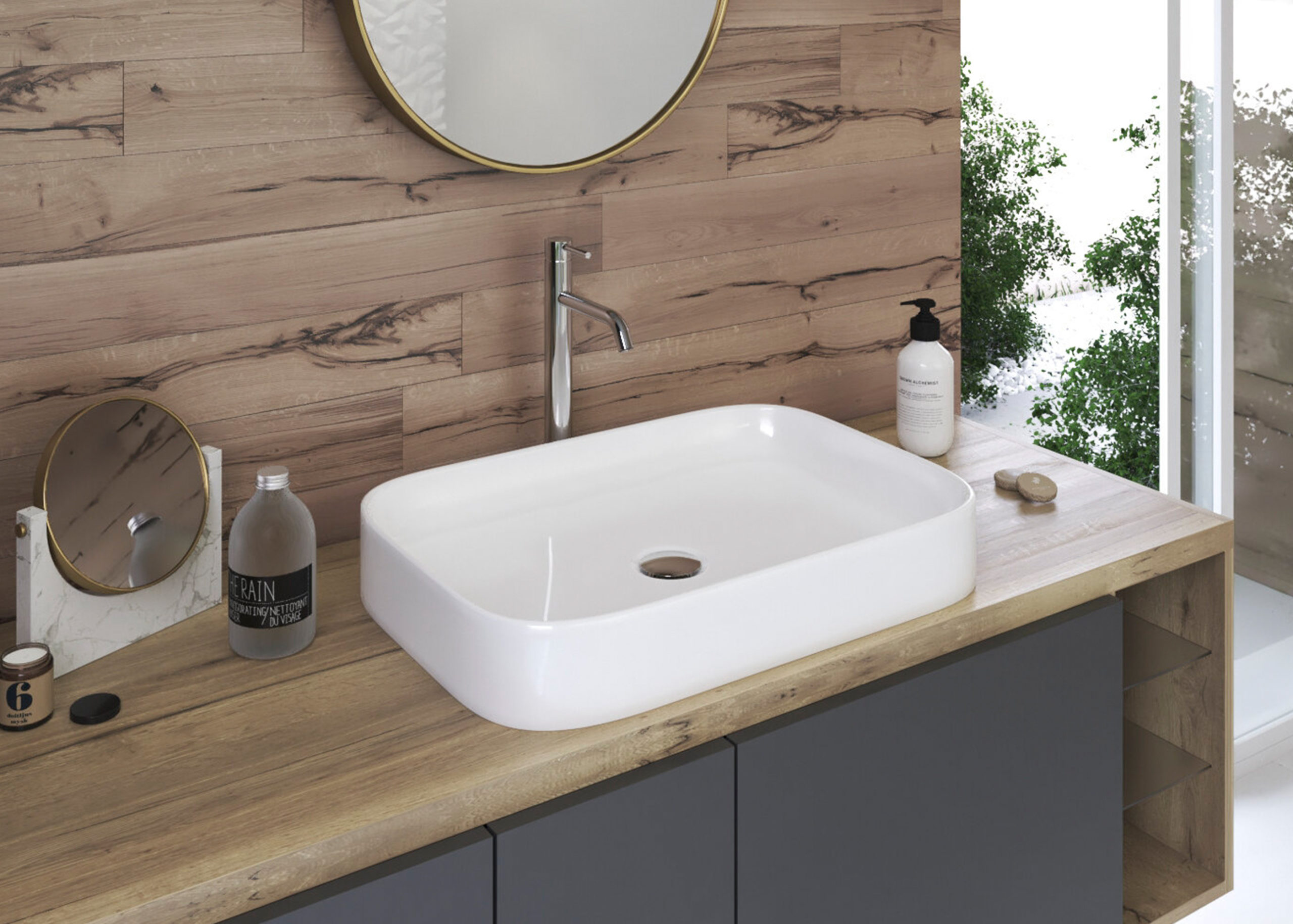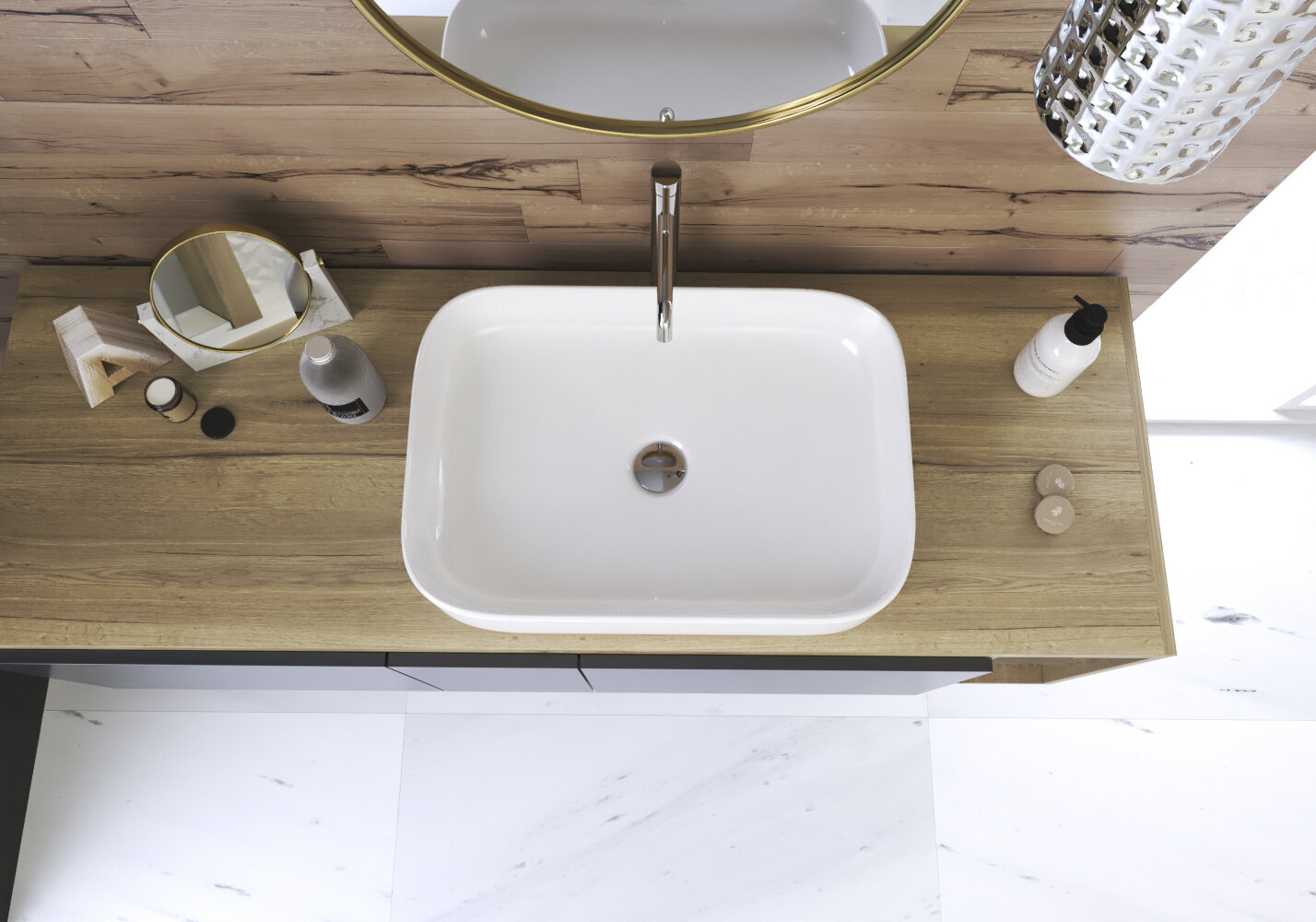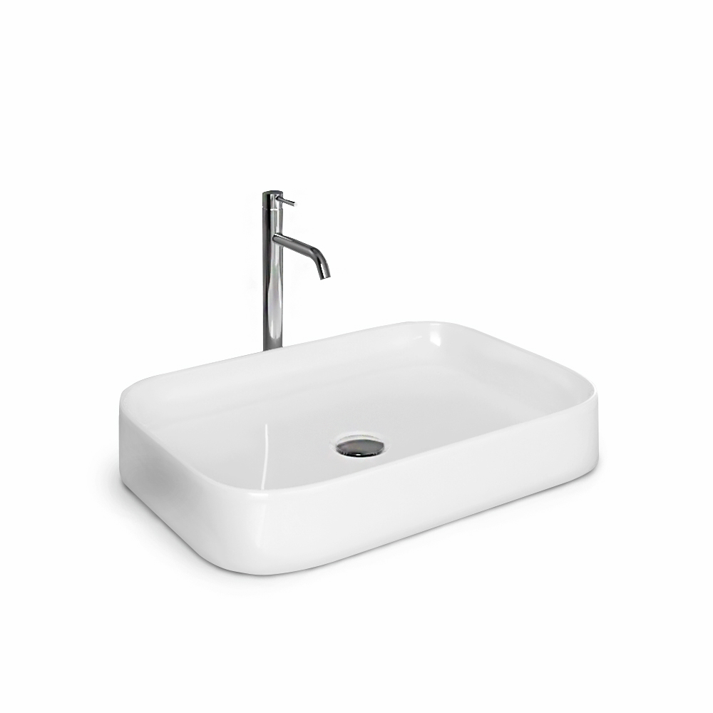 Obdĺžnikové keramické umývadlo so zaoblenými rohmi bez otvoru pre batériu, bez prepadu.