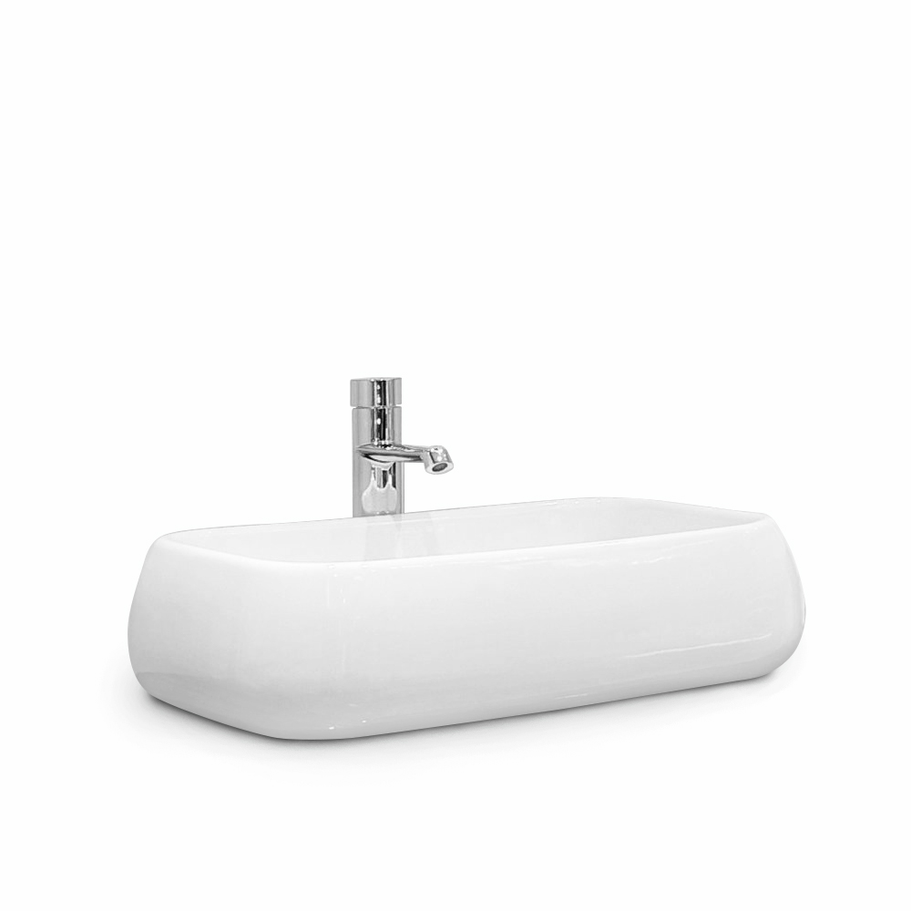Obdĺžnikové keramické umývadlo so zaoblenými rohmi bez otvoru pre batériu, bez prepadu.