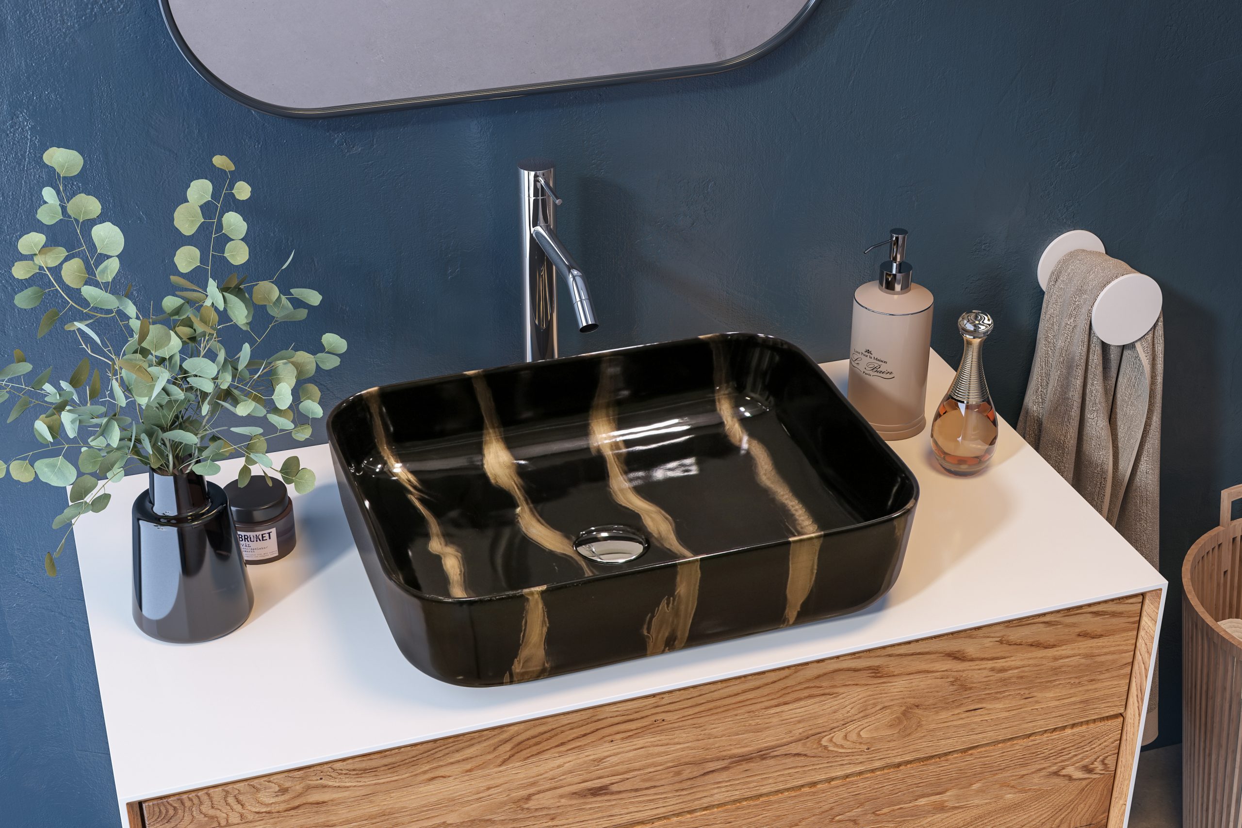 Obdĺžnikové keramické umývadlo so zaoblenými rohmi bez otvoru pre batériu, bez prepadu. Dekor ručnej práce.