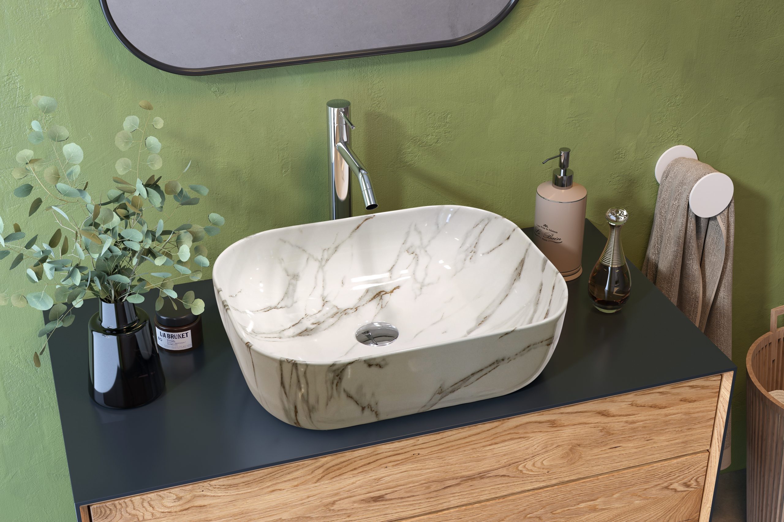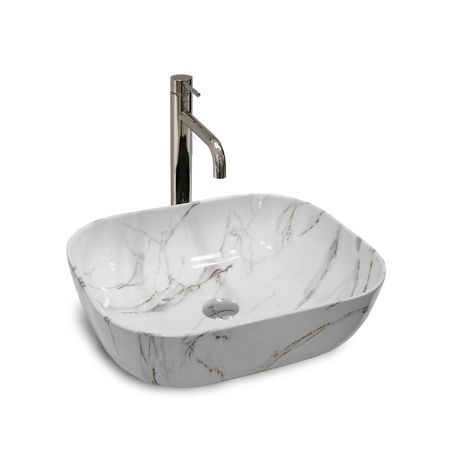 Obdĺžnikové keramické umývadlo s povrchovou štruktúrou mramoru a oblými rohmi, bez otvoru pre batériu, bez prepadu.