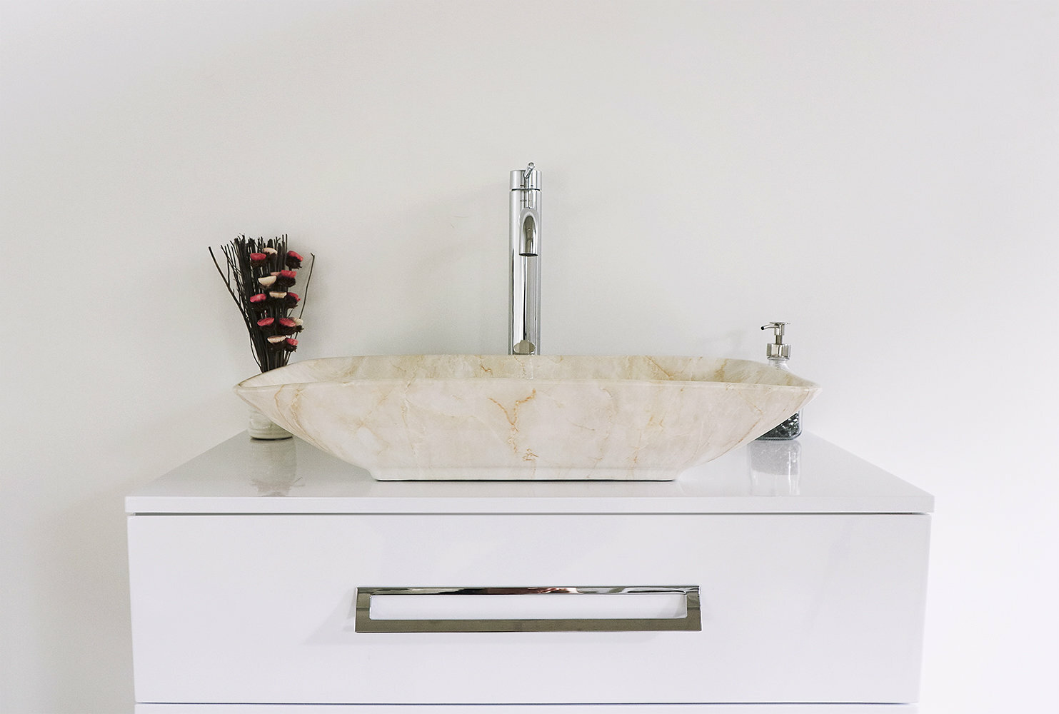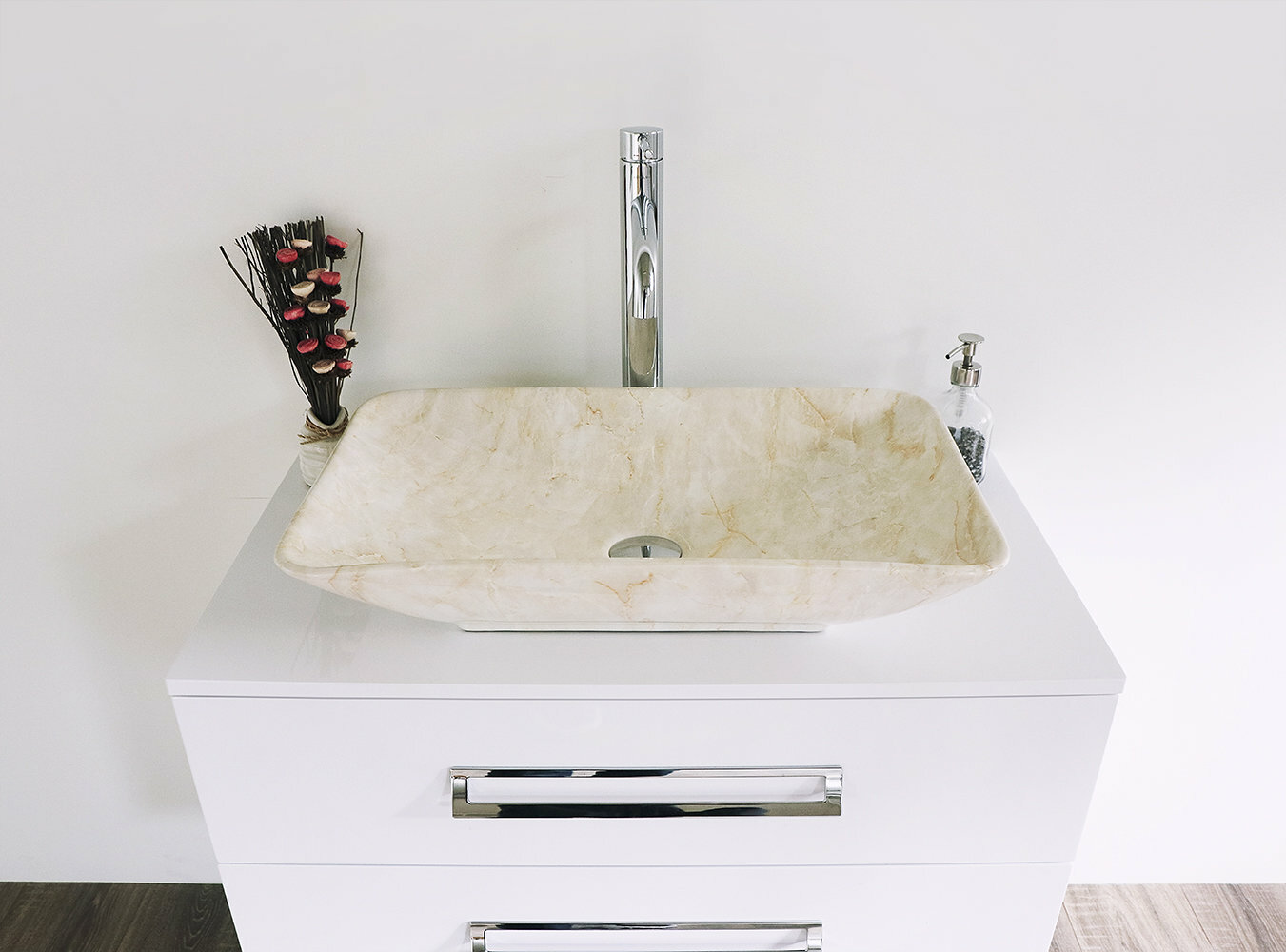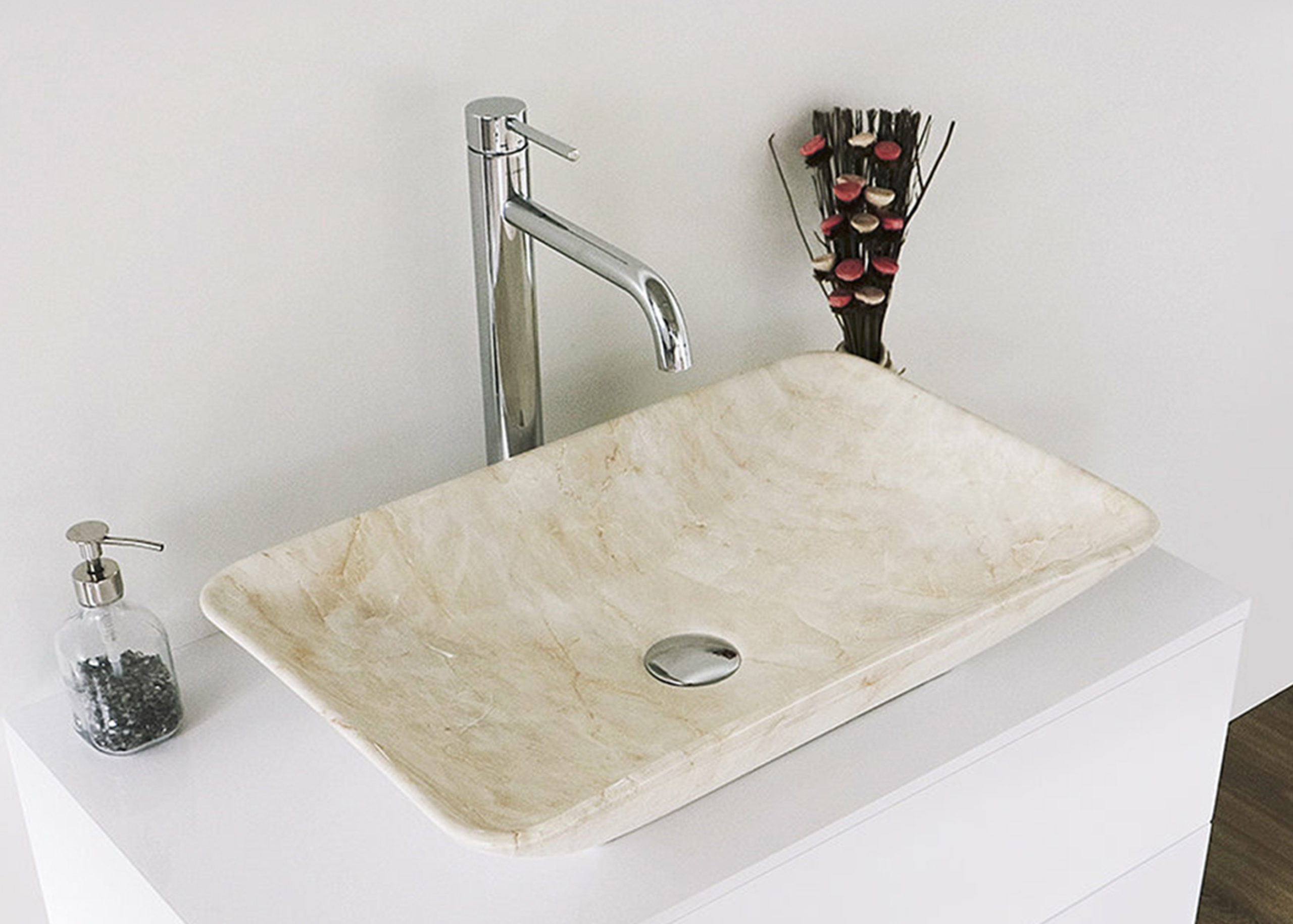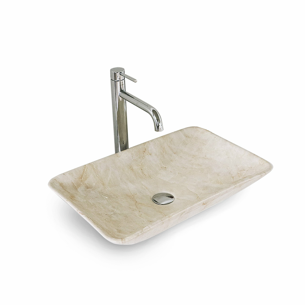 Obdĺžnikové keramické umývadlo s povrchovou štruktúrou mramoru a jemne oblými rohmi, bez otvoru pre batériu, bez prepadu.