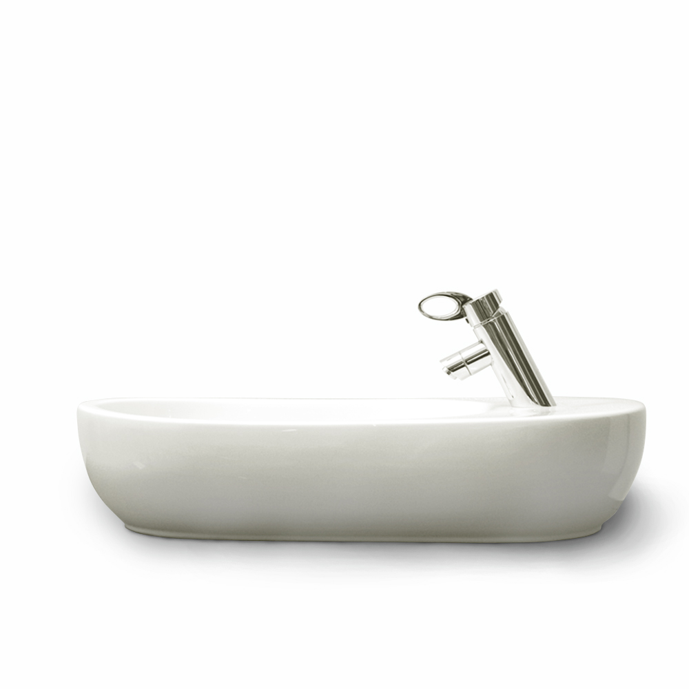 Oválne keramické umývadlo s otvorom pre batériu s excentrickou pozíciou, bez prepadu.
