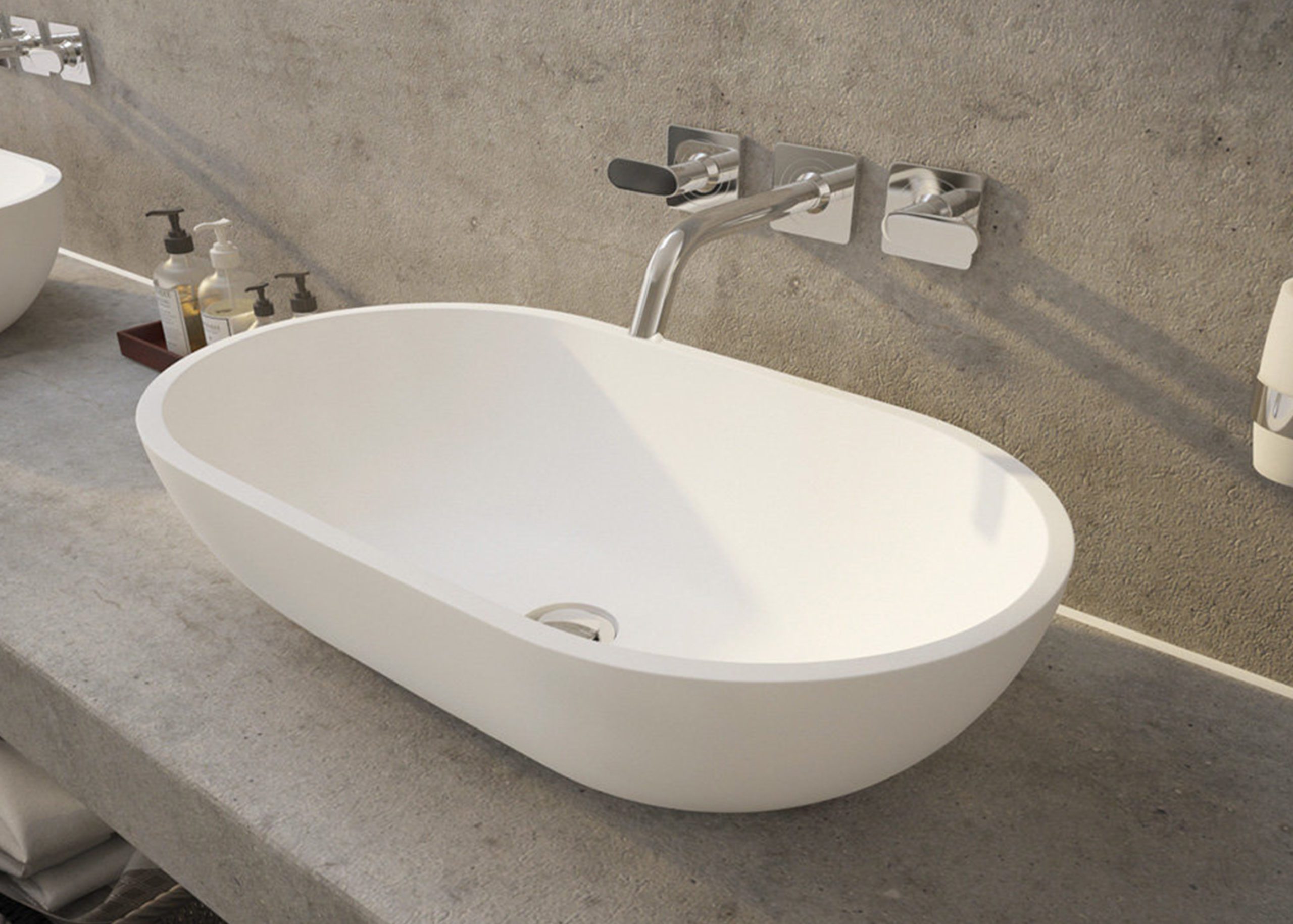 Oválne umývadlo z liateho kameňa bez otvoru pre batériu, bez prepadu.