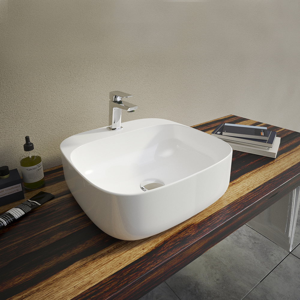 Štvorcové keramické umývadlo so zaoblenými rohmi s otvorom pre batériu, bez prepadu.