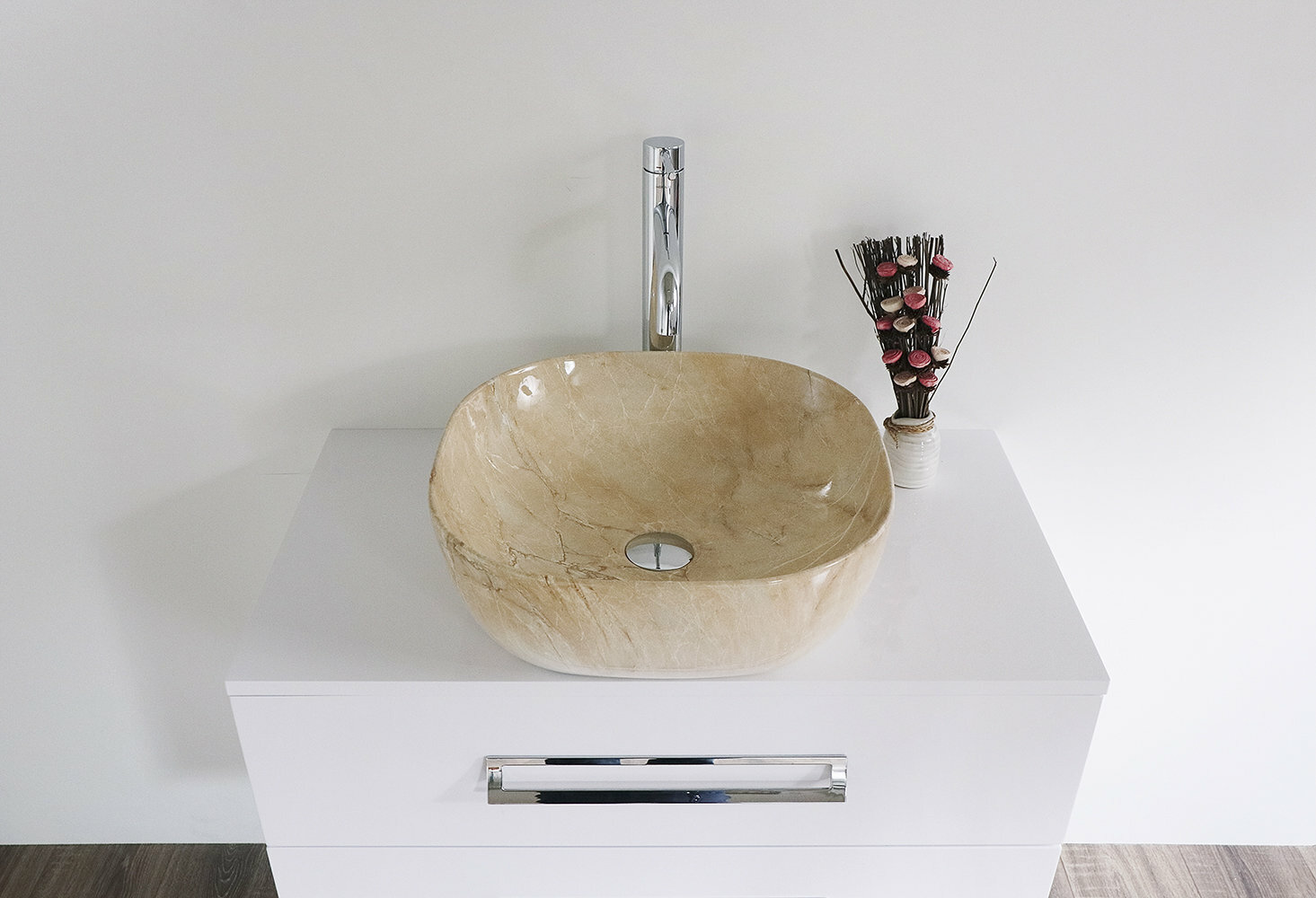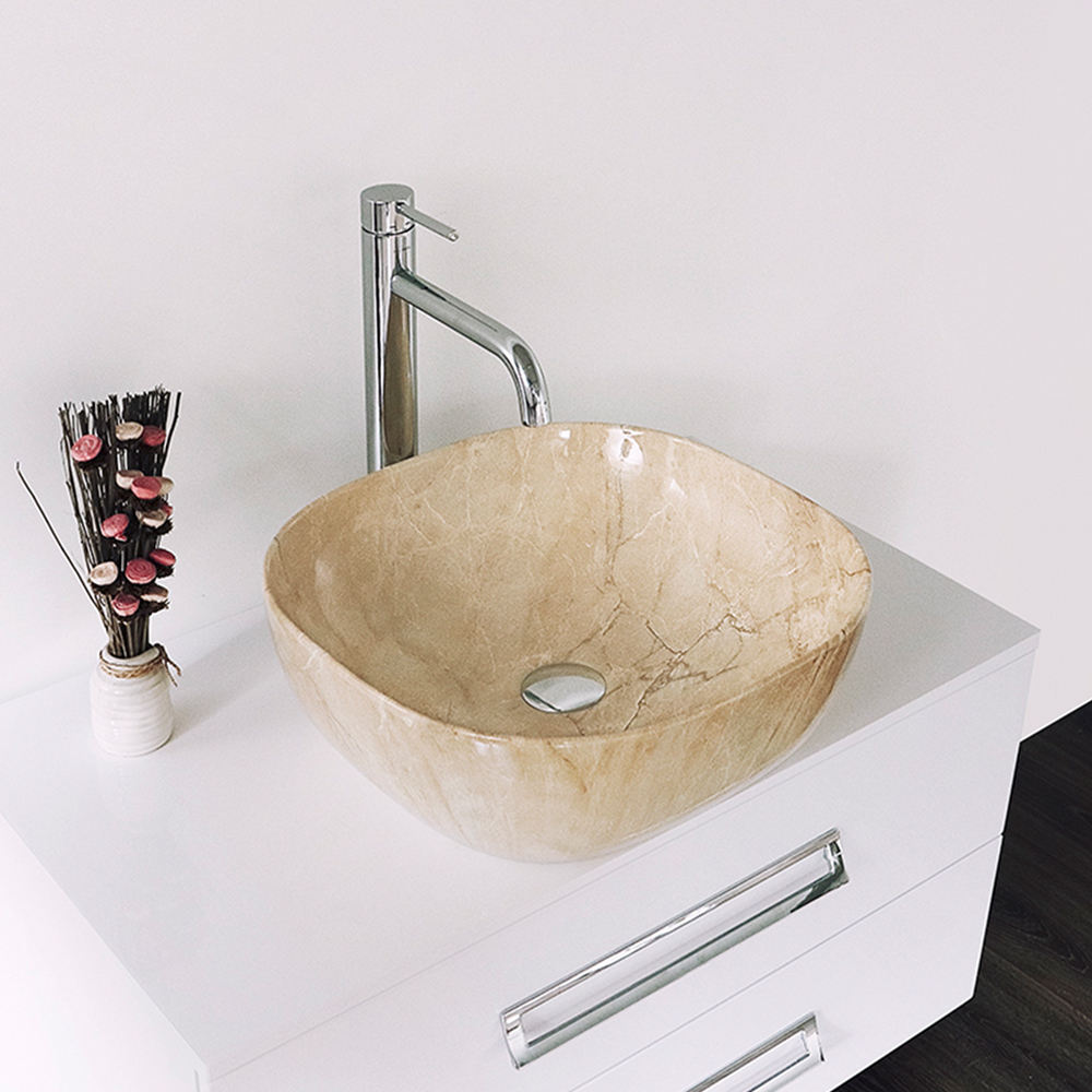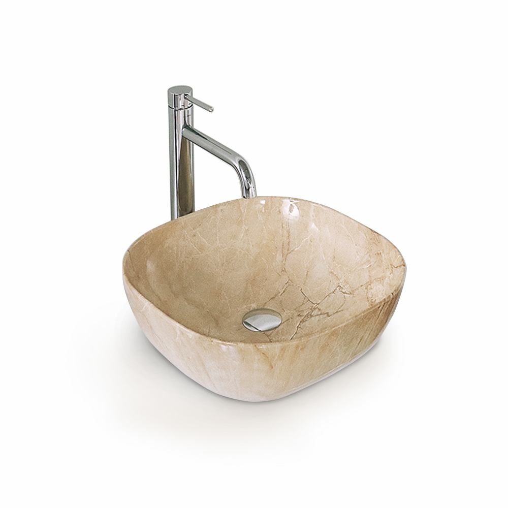 Štvorcové keramické umývadlo so zaoblenými rohmi s povrchovou štruktúrou mramoru, bez otvoru pre batériu, bez prepadu.